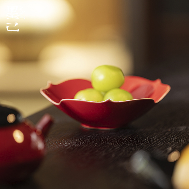 墨己の赤いお祝いの花型のお茶の皿の陶磁器の家庭用の結婚祝いの早生の貴子の果物の皿は多く乾いた皿の壺を使って承を得ます。