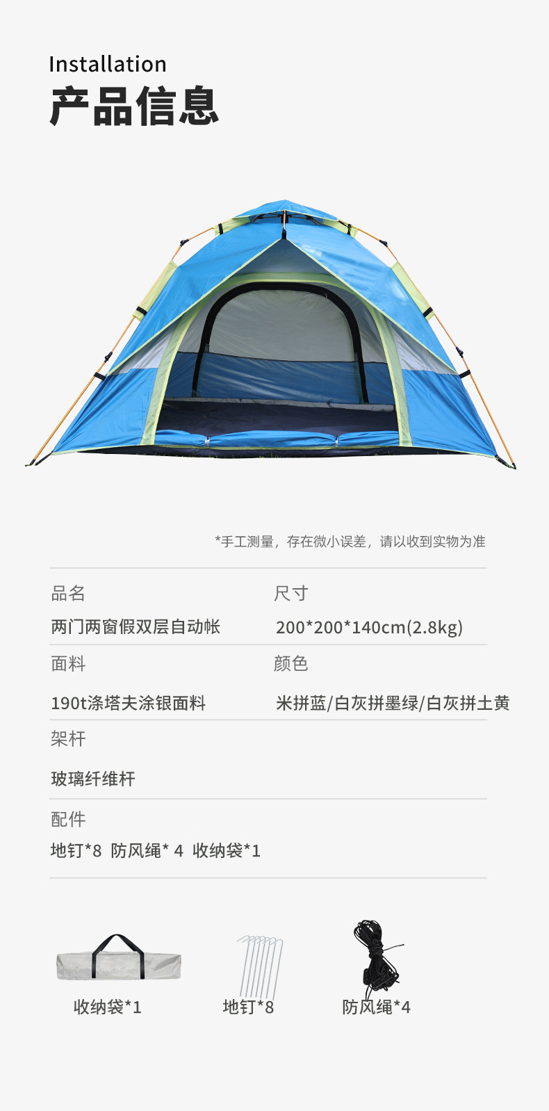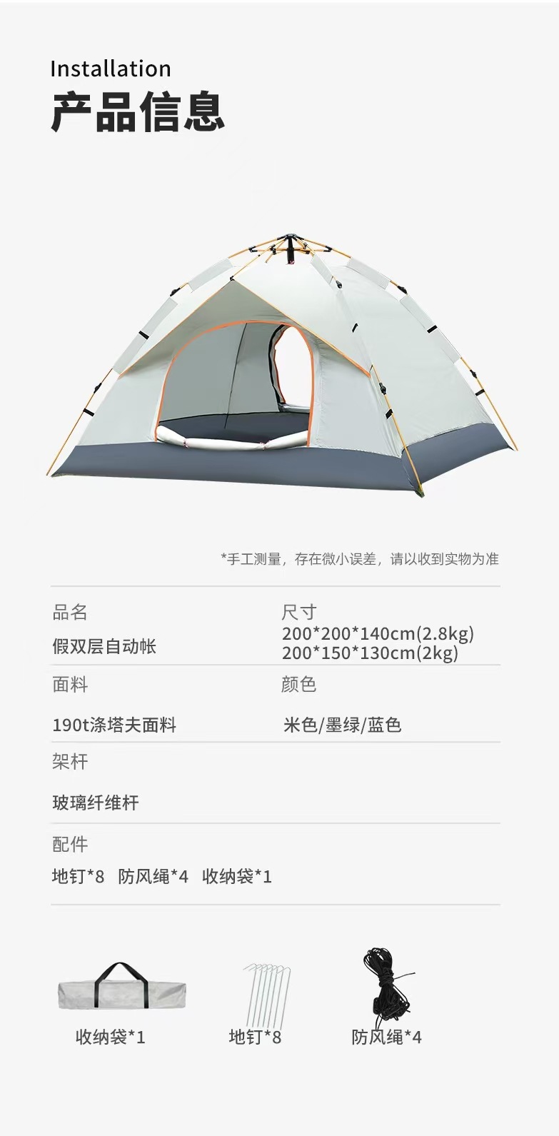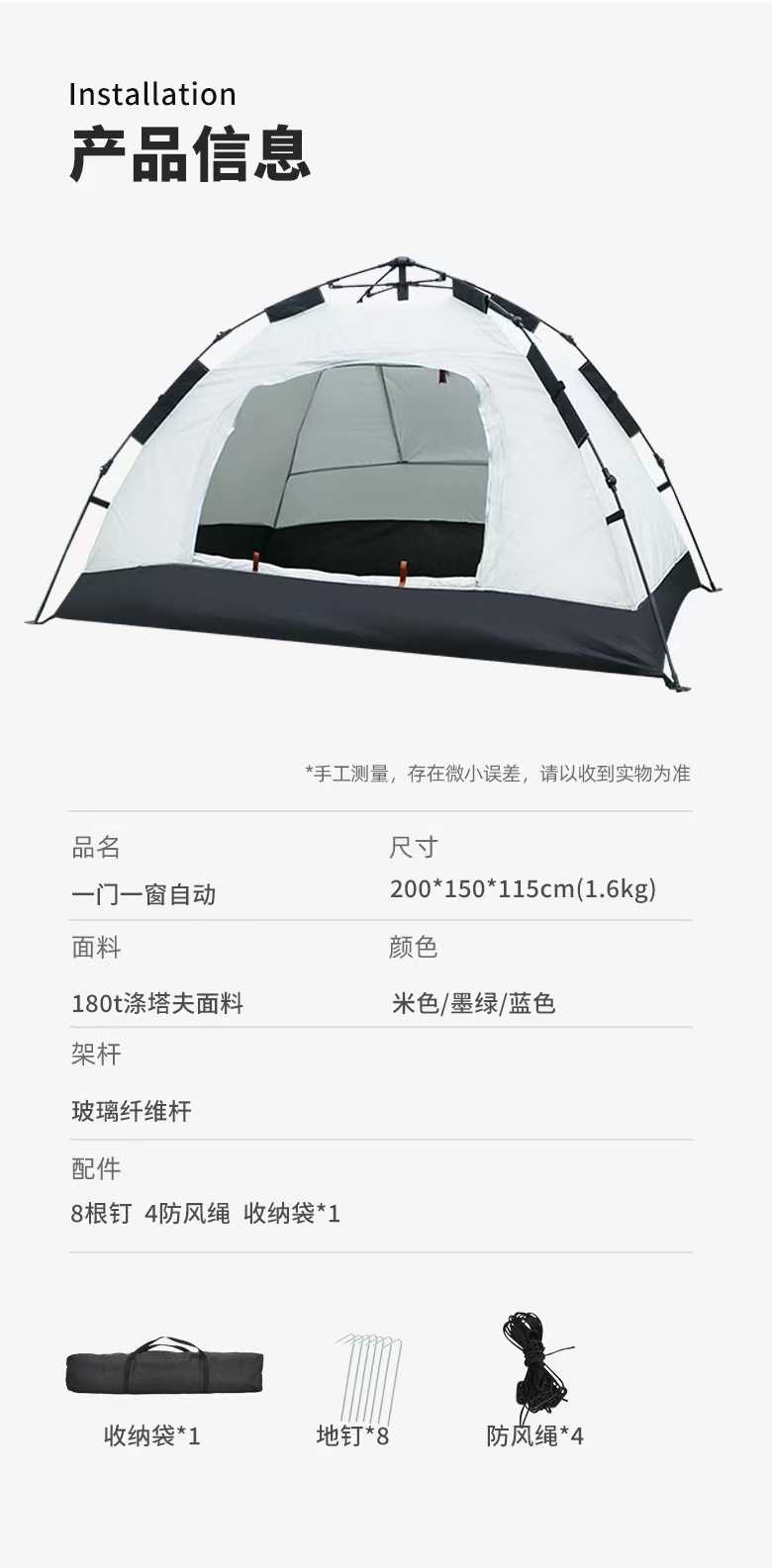 拉链卡顿时,用蜡烛或石蜡润滑,切勿强行拉扯,铝杆用干布擦拭后存放,若关节处有泥沙需清理干净,防止卡顿,地钉生锈可用砂纸打磨,涂抹少量润滑油防锈,每季度取出通风一次,保持面料弹性!