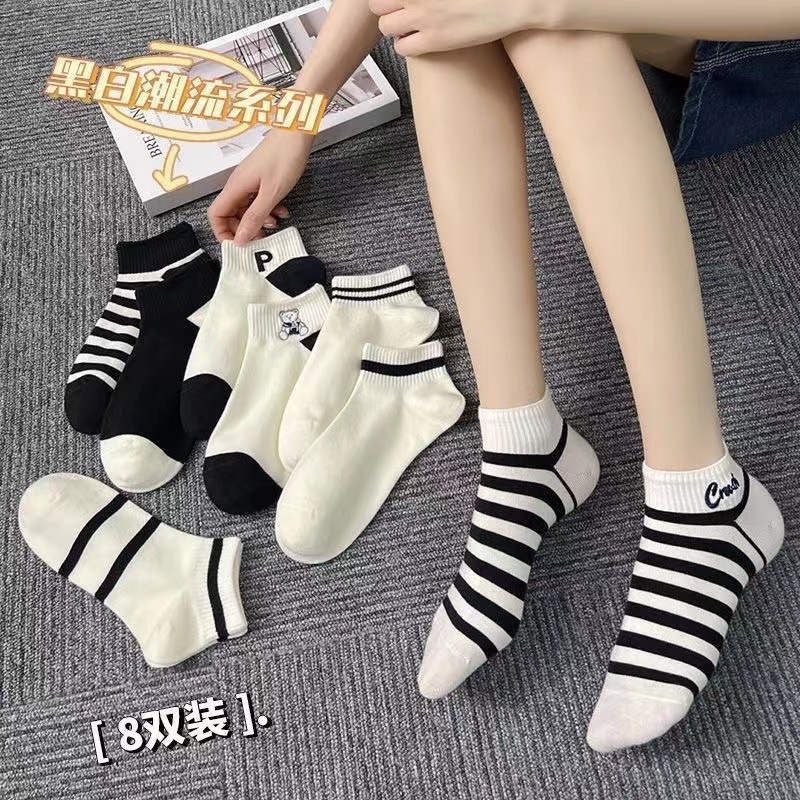 夏の女性ソックスinsのファッションは春秋モデルの低い口の浅いストライプのソックスのかわいい通気性の女性の靴下の白黒を合わせます。