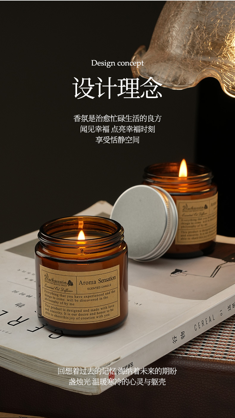 ニッチな香りのキャンドル、茶色のカップ、小さな茶色のボトル、自宅の寝室のアロマテラピー、フレグランスギフト、植物エッセンシャルオイルのお土産