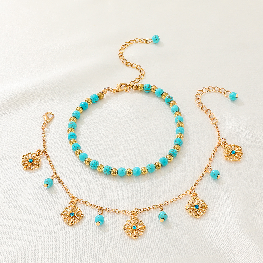 クロスボーダーの新型レトロなボヘミアン風の緑松石の数珠の彫刻の透かし彫りの2つのセットの足のチェーンの足の装飾の卸売り