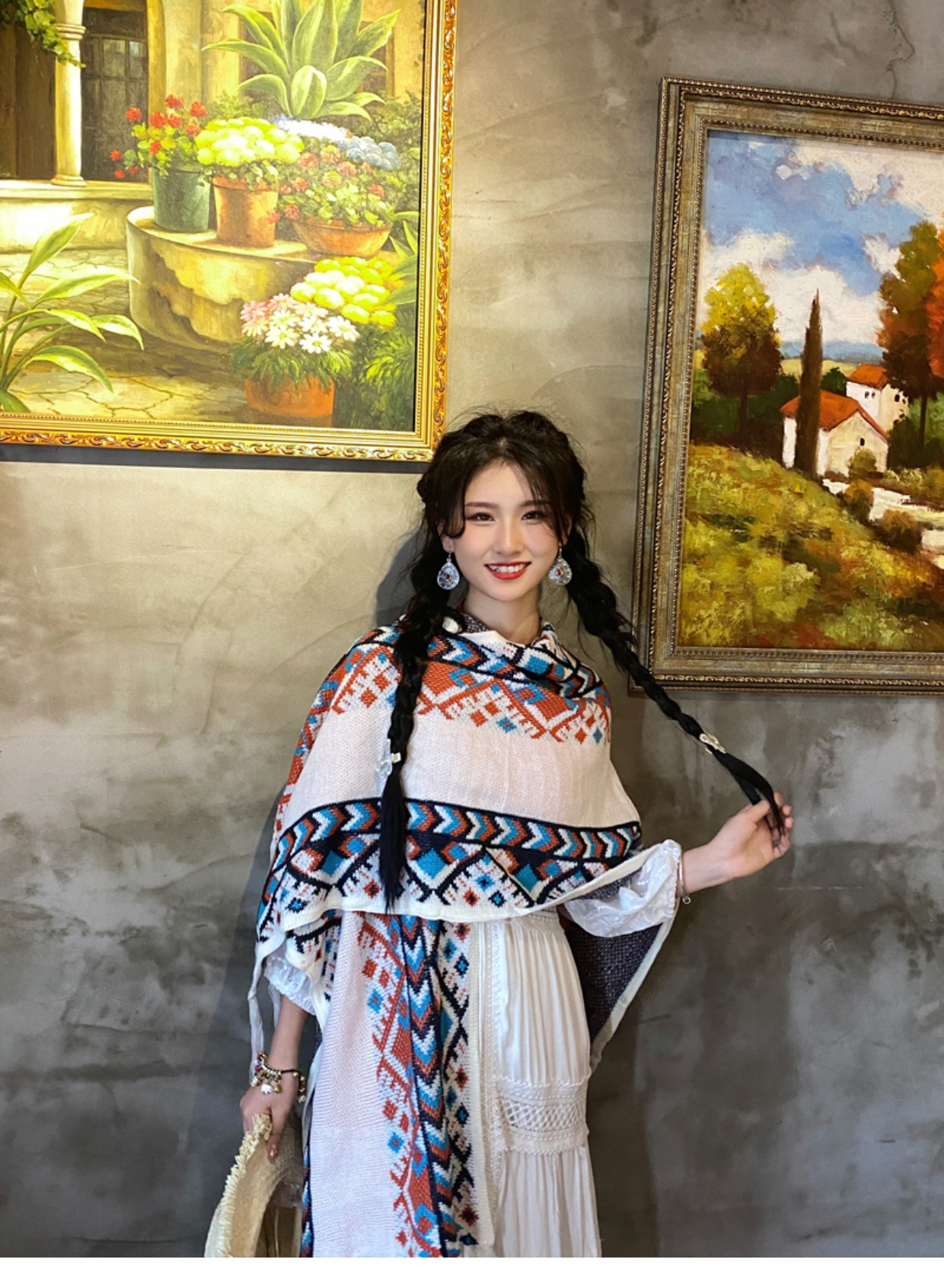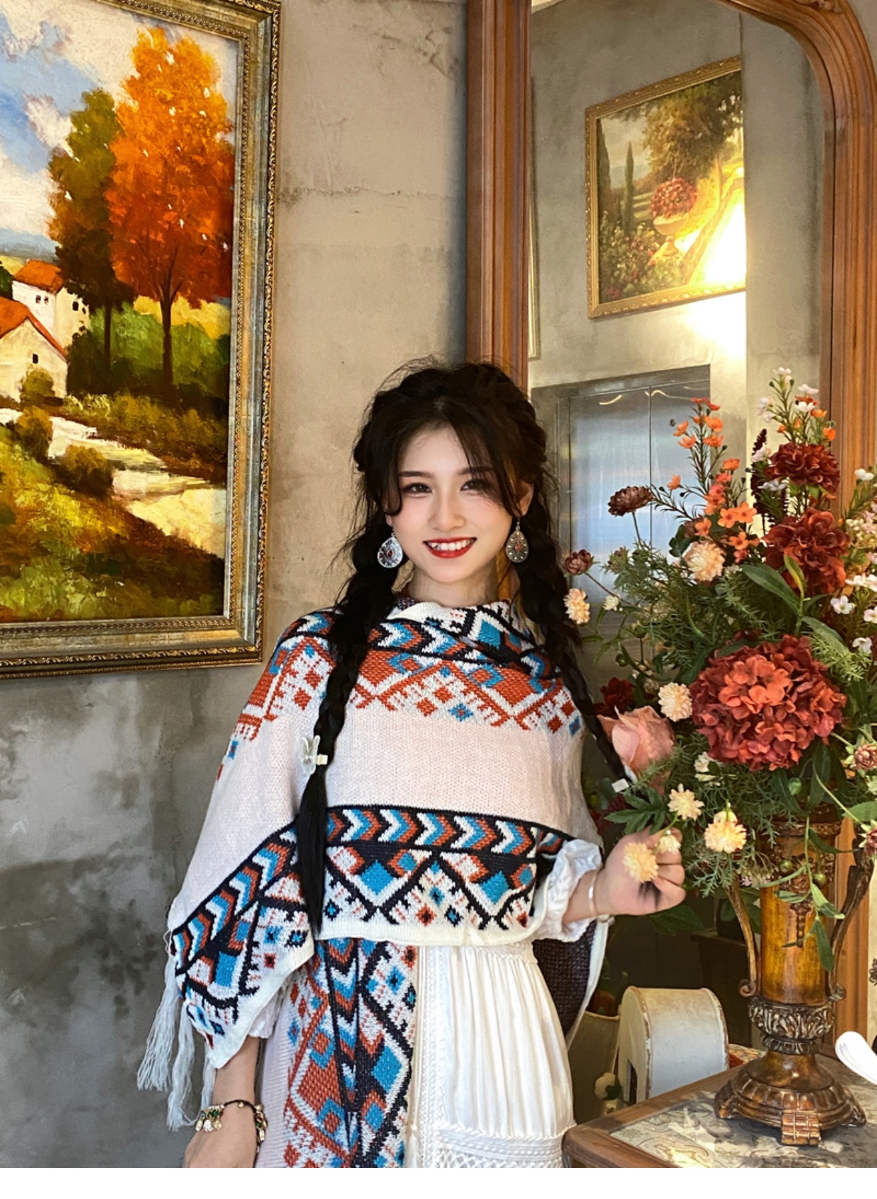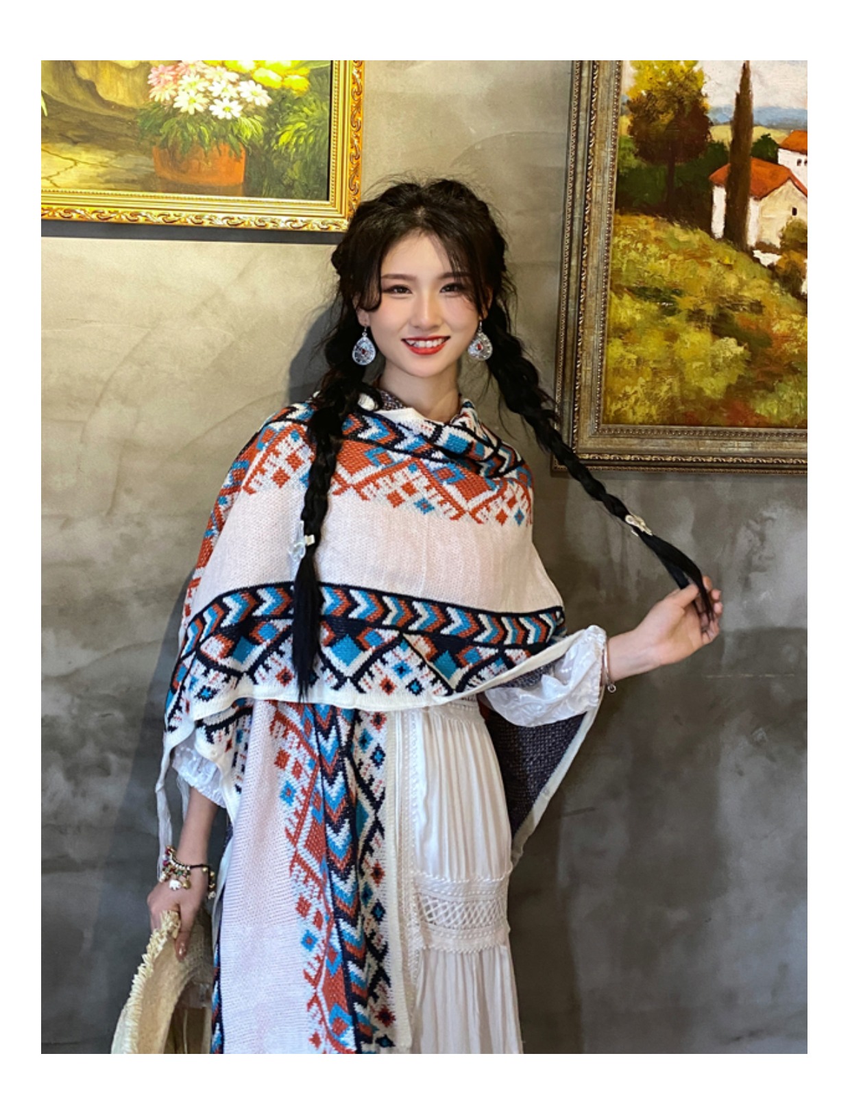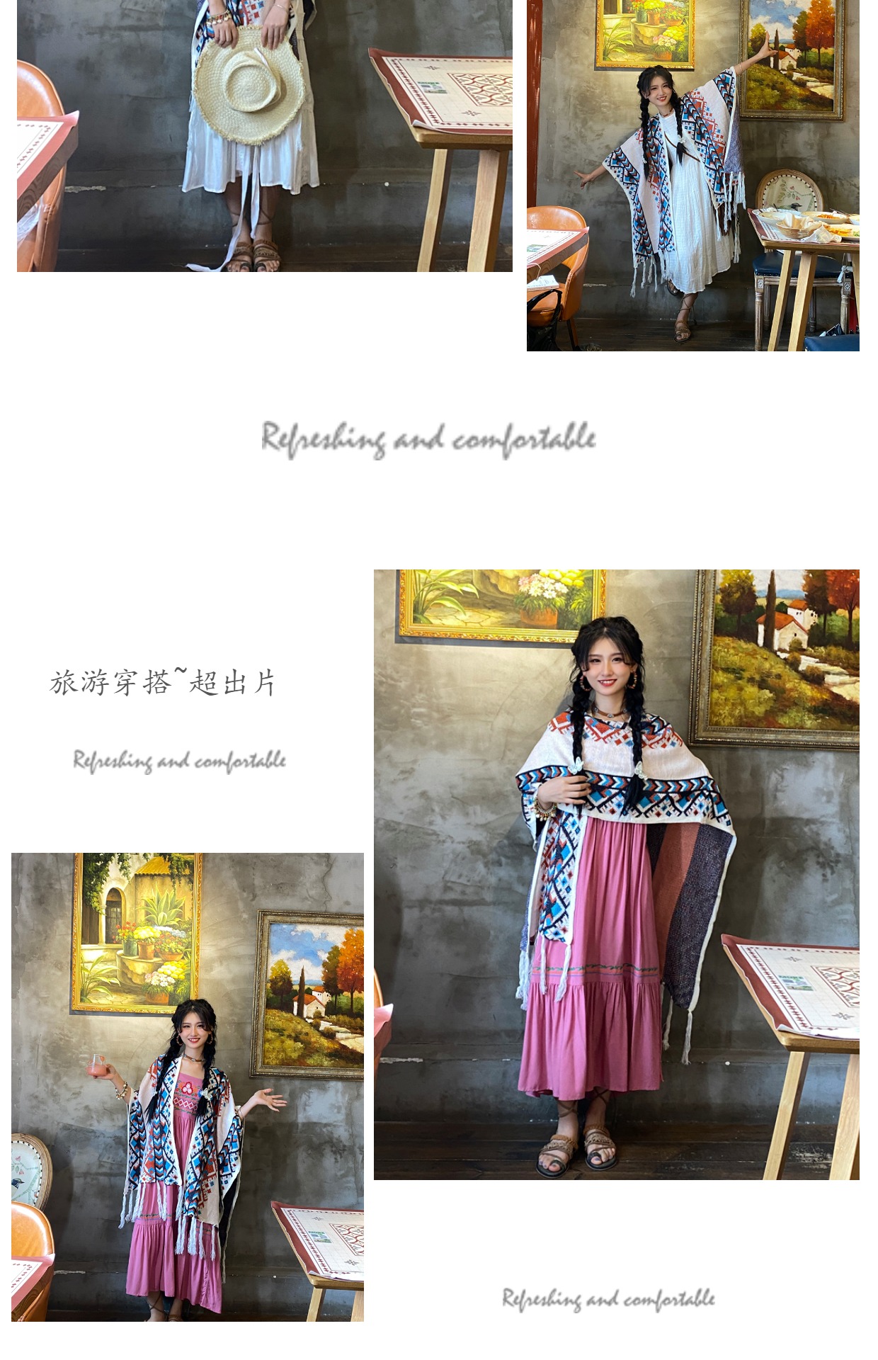 新型の流蘇民族風のマントの女性雲南チベット旅行は保温写真を着てマフラーを編みます。
