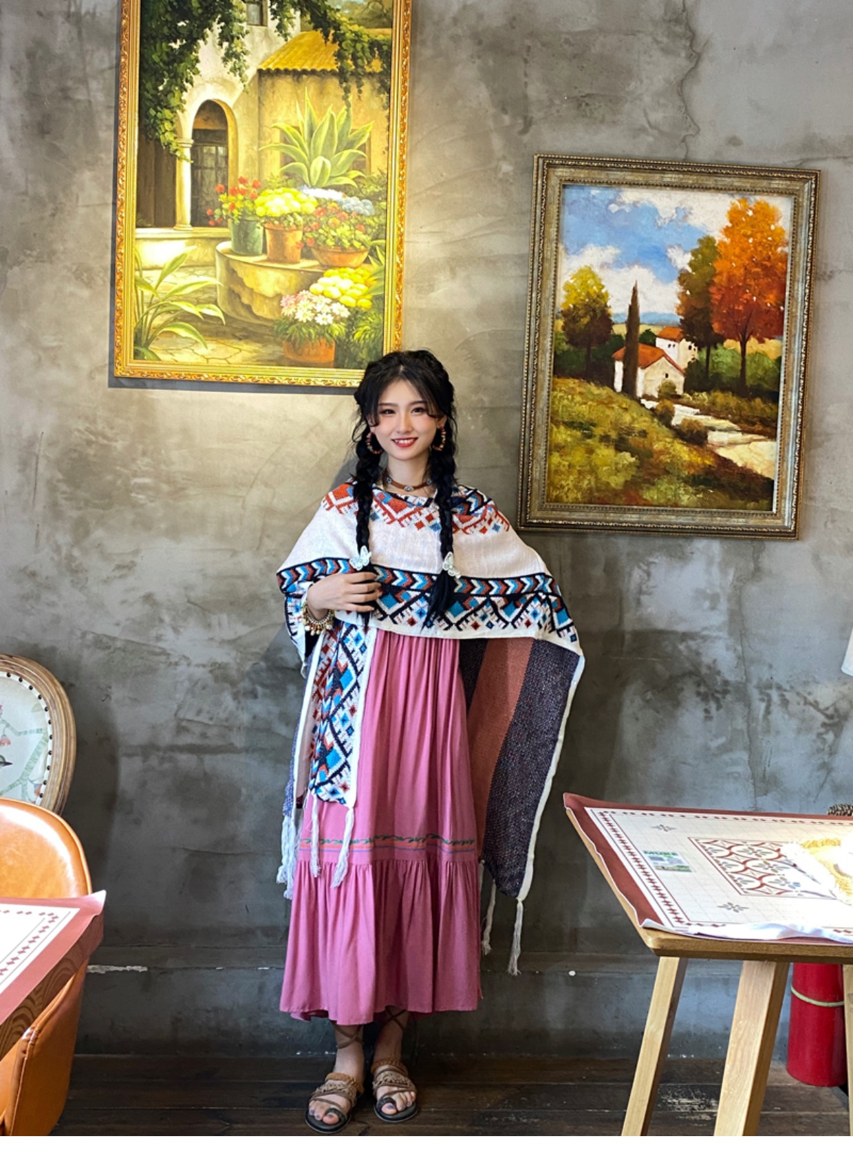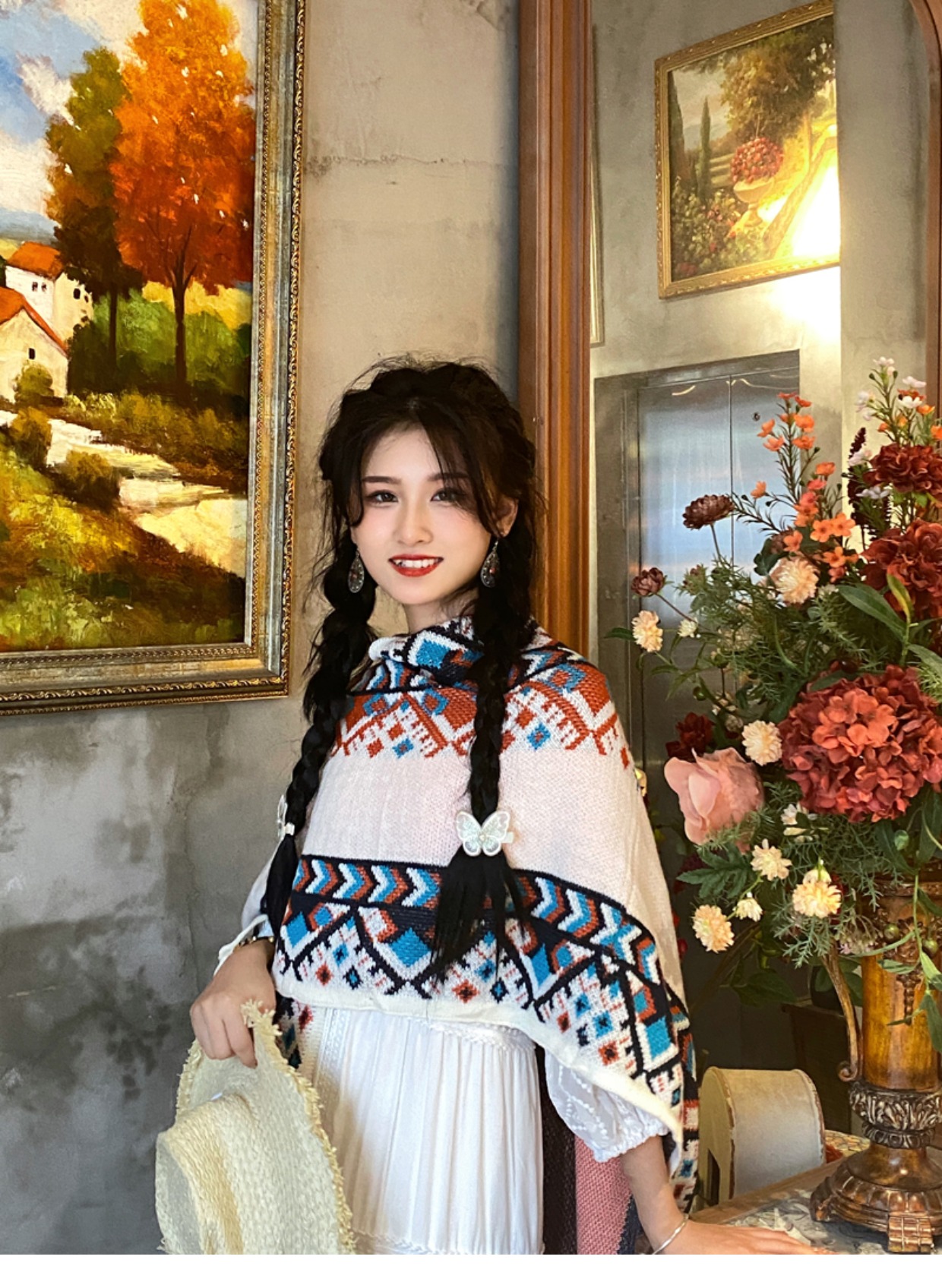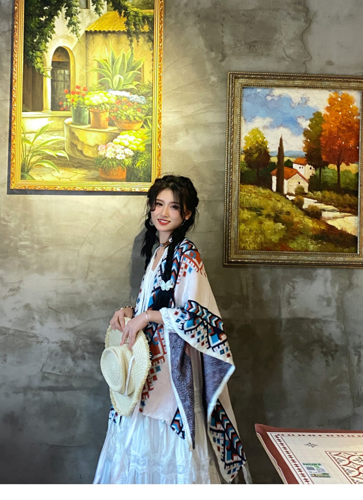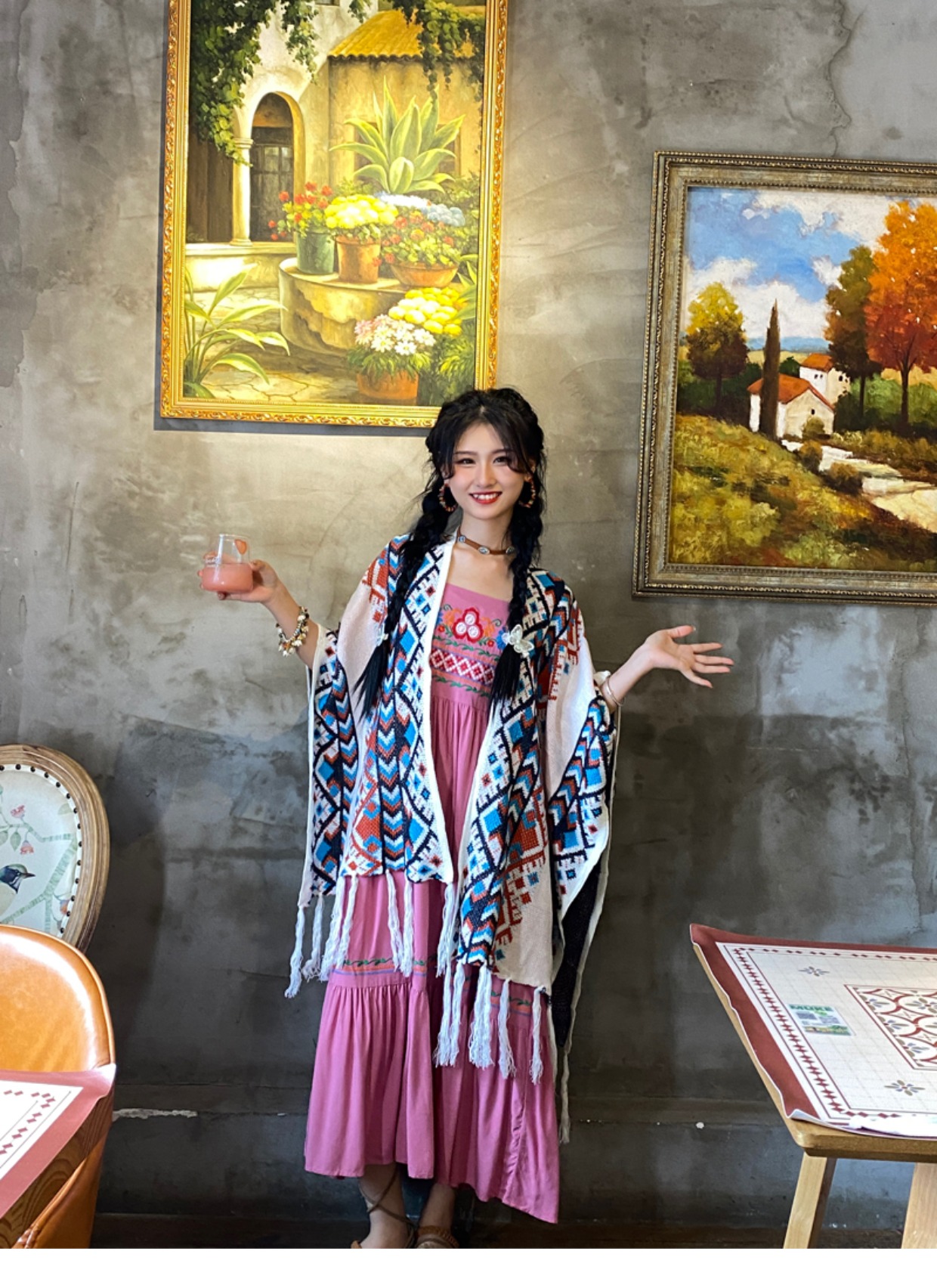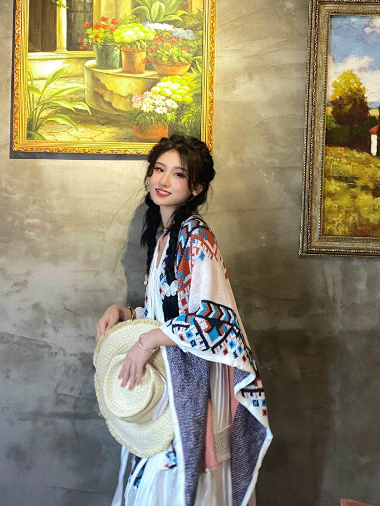新型の流蘇民族風のマントの女性雲南チベット旅行は保温写真を着てマフラーを編みます。