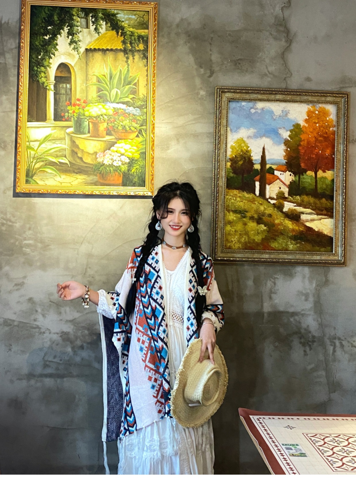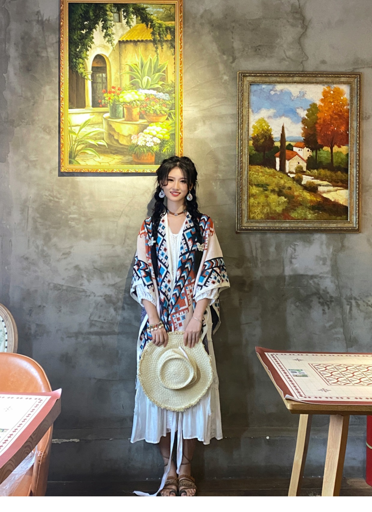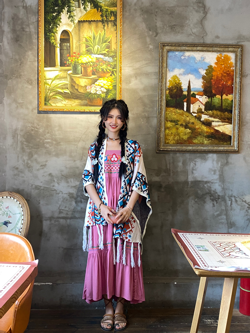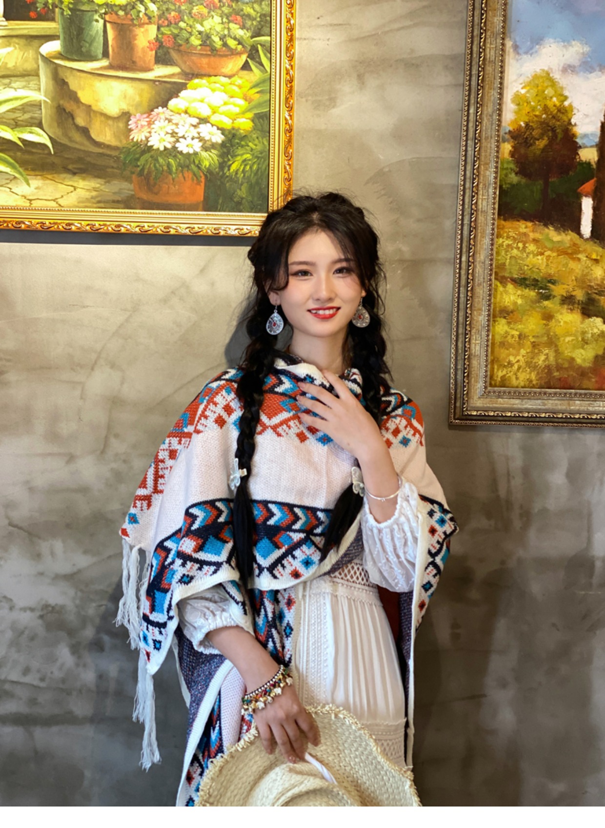 新型の流蘇民族風のマントの女性雲南チベット旅行は保温写真を着てマフラーを編みます。