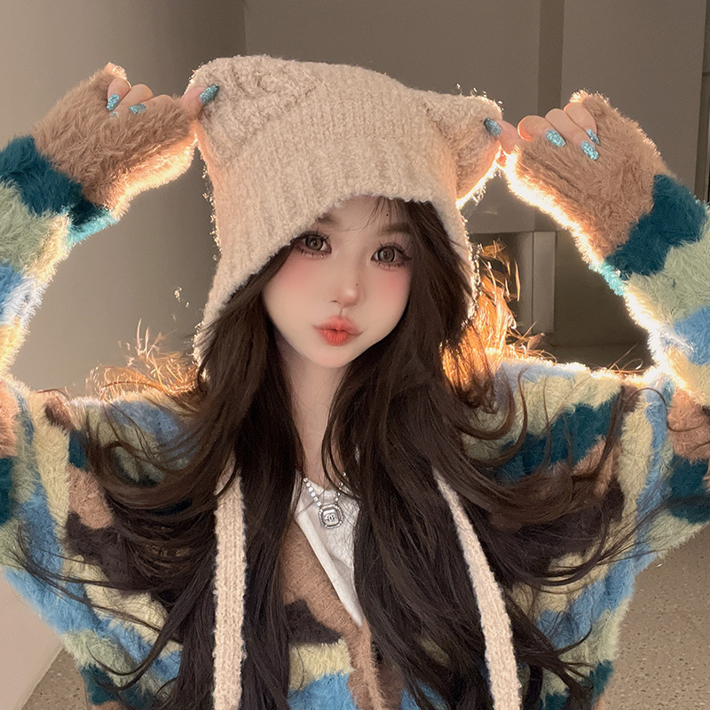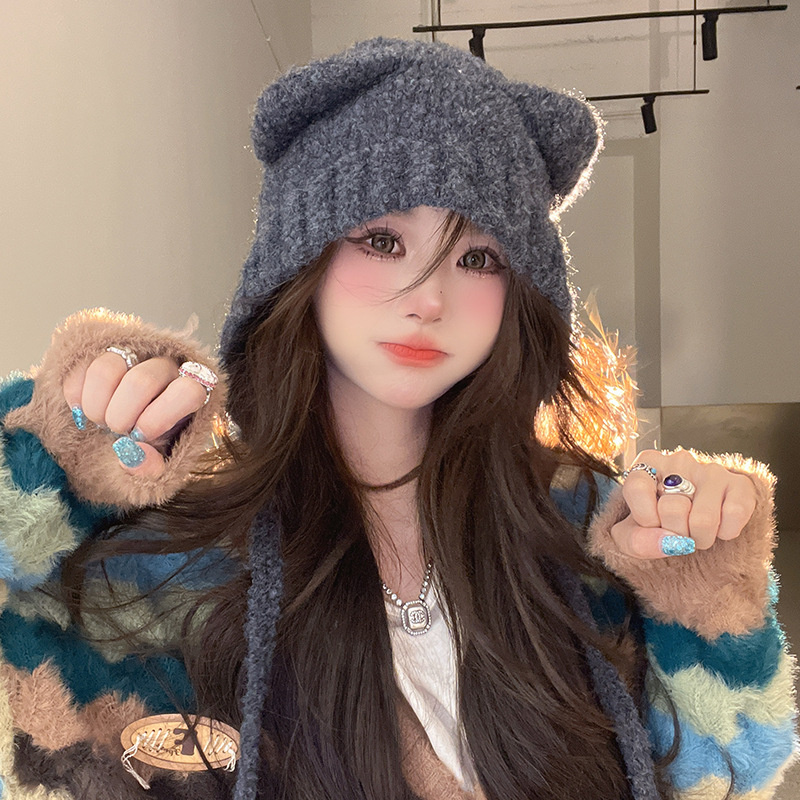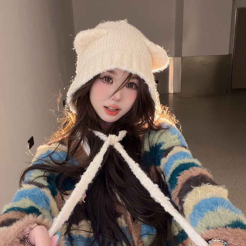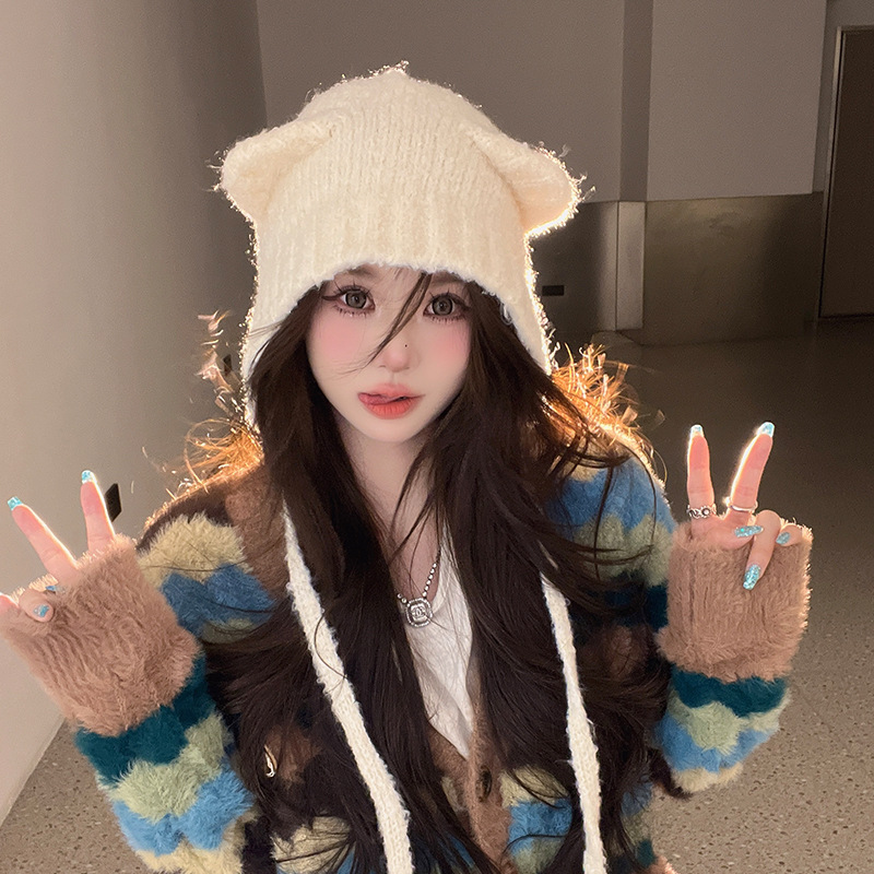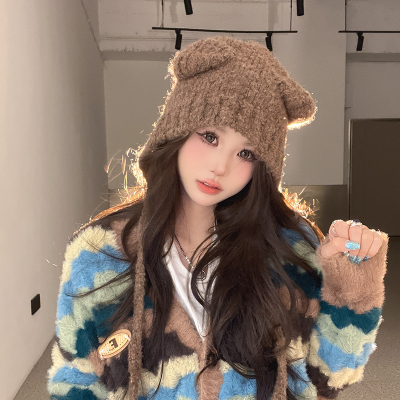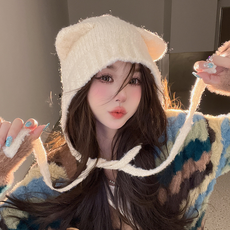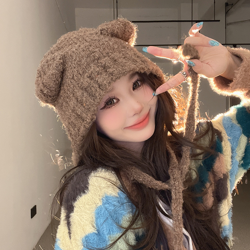 秋冬の新型のかわいい熊の保温帽の女の子は顔の小さい耳の毛糸の帽子を保護します。