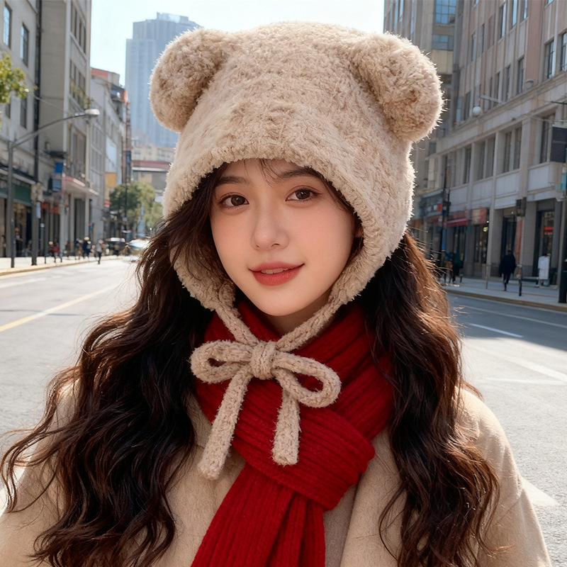 ABOUTHEXX 高品質で可愛いクマ耳付きぬいぐるみ帽子、女性用暖かいニット耳当て帽子、男性用小顔効果あり