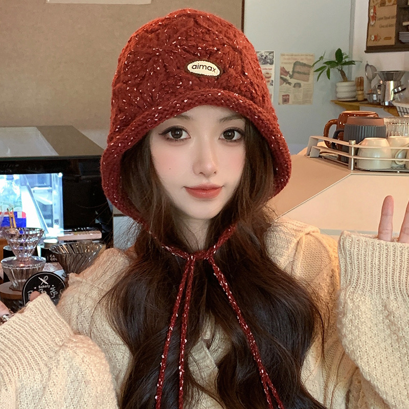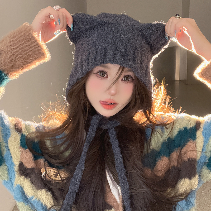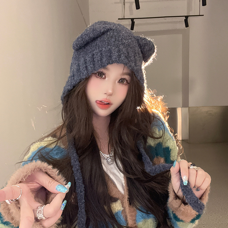 蓝色绑带针织包头帽女秋冬出游毛绒毛线帽显脸小户外保暖韩系帽子