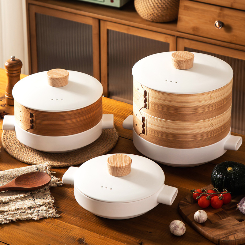 日本式蒸し器土鍋蒸し器付き鍋煮込み鍋竹製多層ホテル家庭用陶磁器蒸し器大トランペット浅鍋