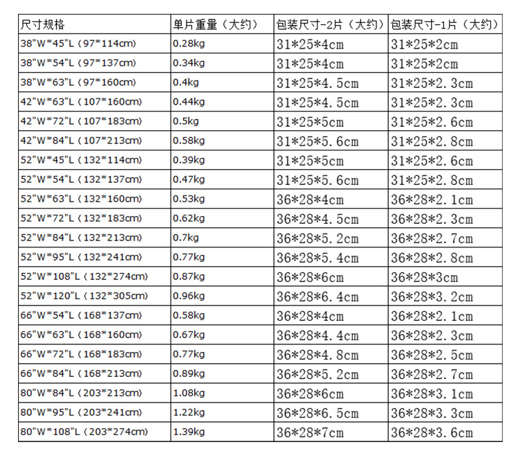仕様 42 "W * 63" L(107*160cm)一枚,42 "W * 72" L(107*183cm)一枚,42 "W * 84" L(107*213cm)一枚,52 "W * 63" L(132*160cm)一枚,52 "W * 72" L(132*183cm)一枚,52 "W * 84" L(132*213cm)一枚,52 "W * 95" L(132*241cm)一枚,52 "W * 108" L(132*274cm)一枚,66 "W * 54" L(168*137cm)一枚,66 "W * 72" L(168*183cm)一枚,66 "W * 90" L(168*229cm)一枚,46 "W * 54" L(117*137cm)一枚,46 "W * 72" L(117*183cm)一枚