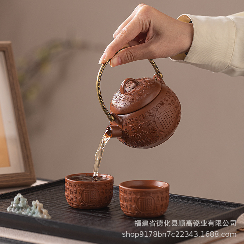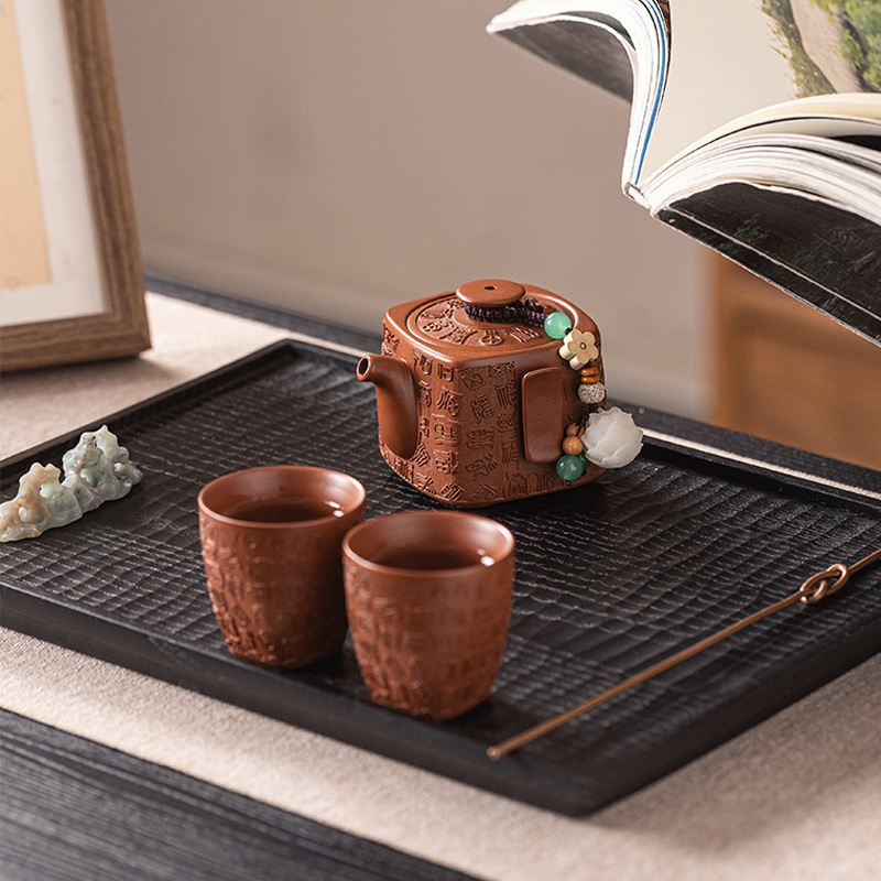 高級紫砂手作りポット、四角ポット、1ポット、2カップ、精巧に彫られたティーセット、ホームギフト、カンフーティーセット、卸売