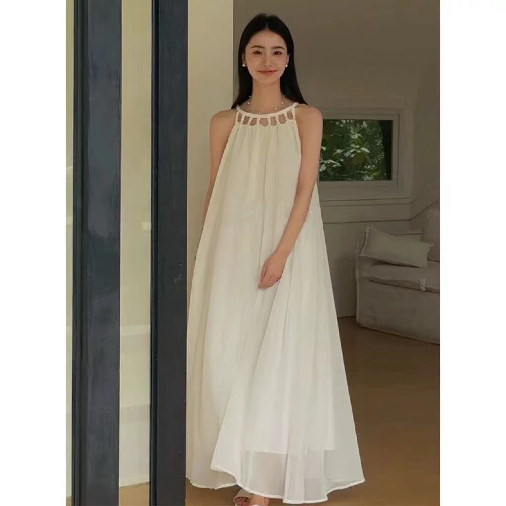 2026源头工厂跨境白色蕾丝网纱吊带度假风连衣长裙
