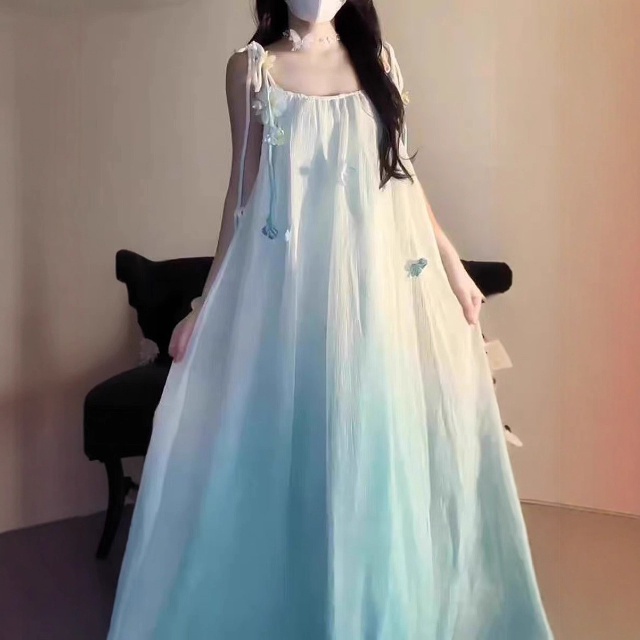 温柔风蓝色渐变吊带连衣裙女夏季海边度假沙滩裙氛围感花朵仙女裙