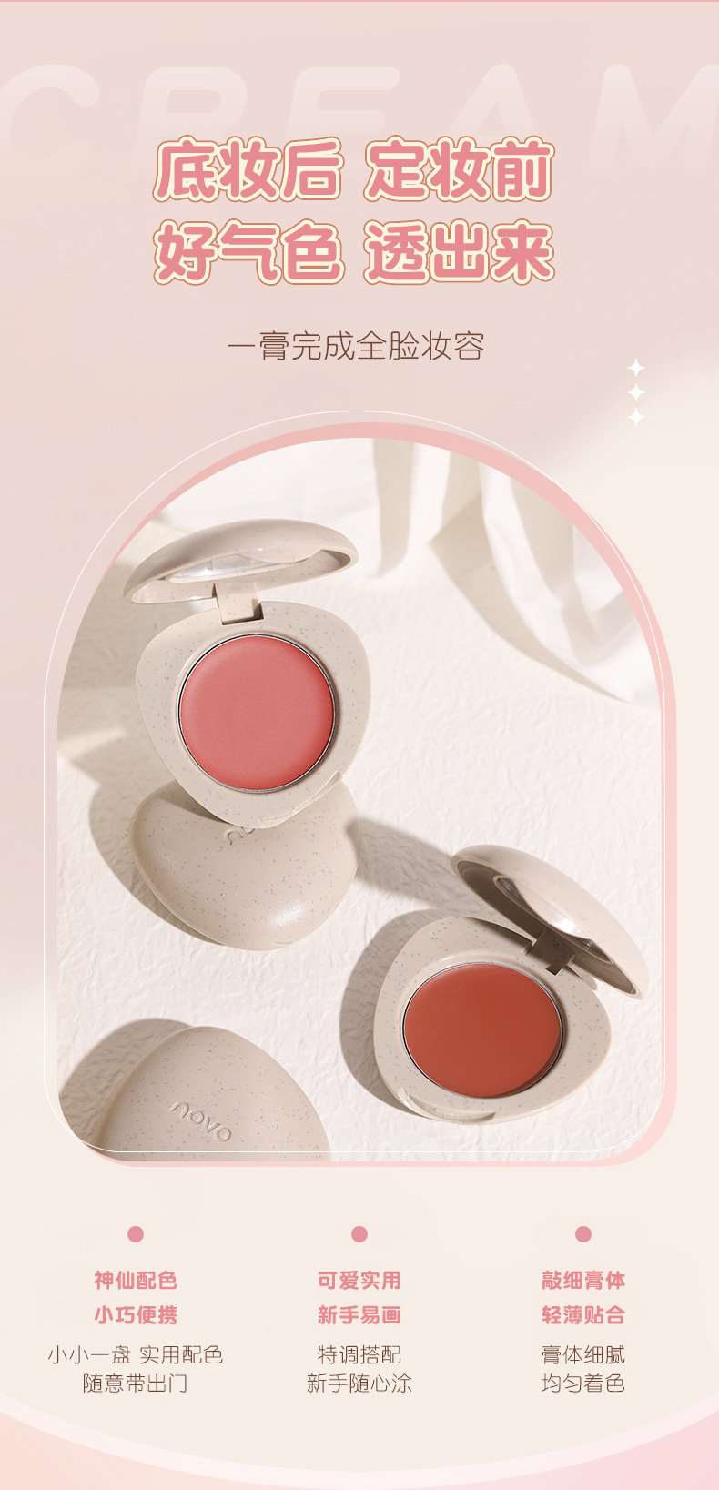 NOVO霊動は顔の2色を飾って、多くクリームを使って頬紅のアイシャドーを修理します。