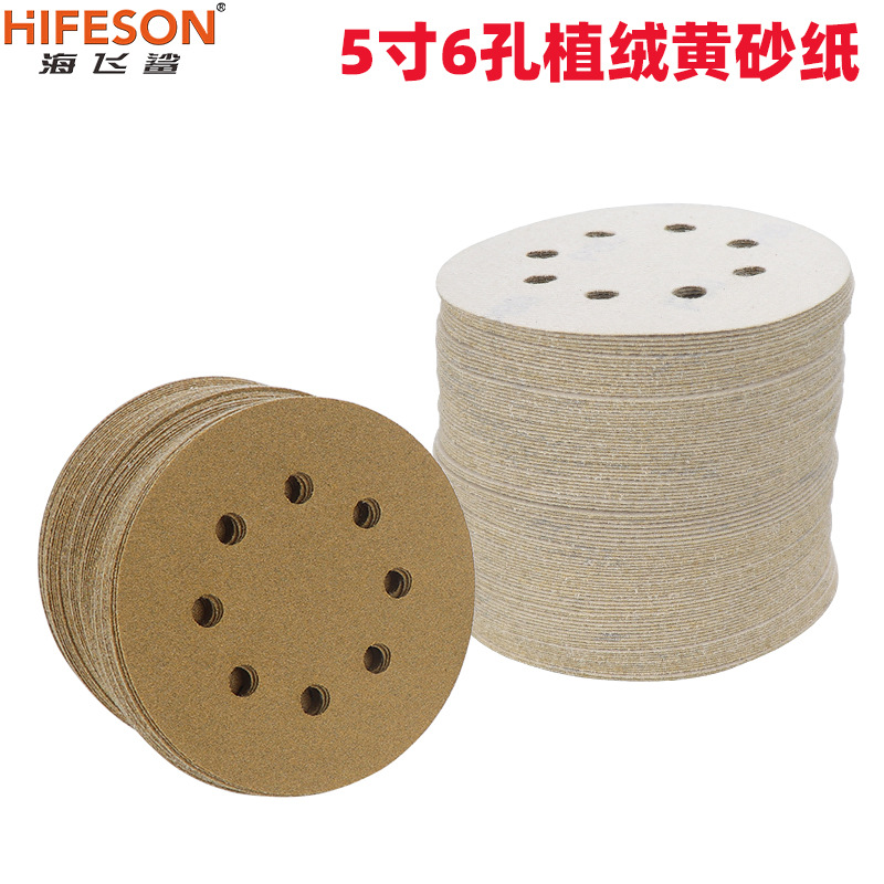 5インチ6穴ドライ研磨サンドペーパー植毛黄色サンドペーパー自己接着ディスク車用研磨サンドペーパー研削機