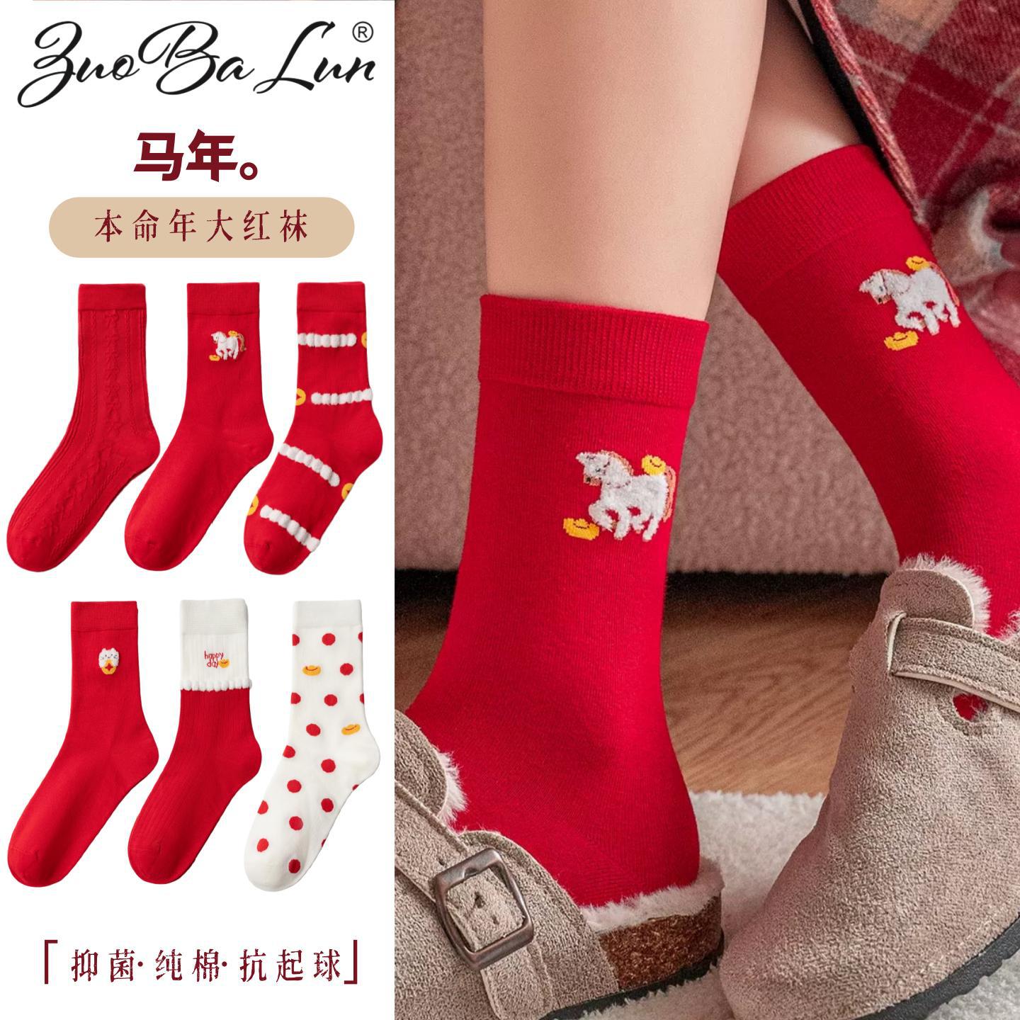 红袜子本命年纯棉2026马年男女款秋冬全棉红色儿童袜中筒过年袜