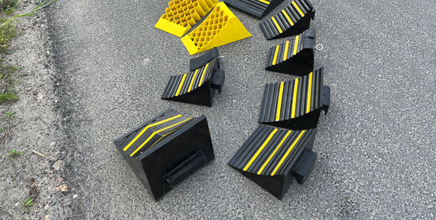ポータブル車両滑り止め装置、三角木、大型トラック用滑り止め、ゴム製駐車場用車止め
