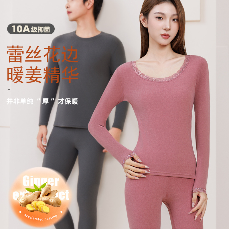 秋冬蕾丝保暖内衣套装女士大圆领花边打底衫男士弹力美体秋衣秋裤