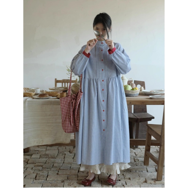 2025春の新型日系文芸格子長袖シャツワンピースのデザイン感がゆったりしています。