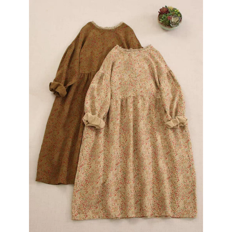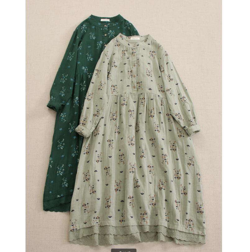 2024春夏新品日系森女系甘美小砕花プリント丸襟二重綿糸長袖ワンピース