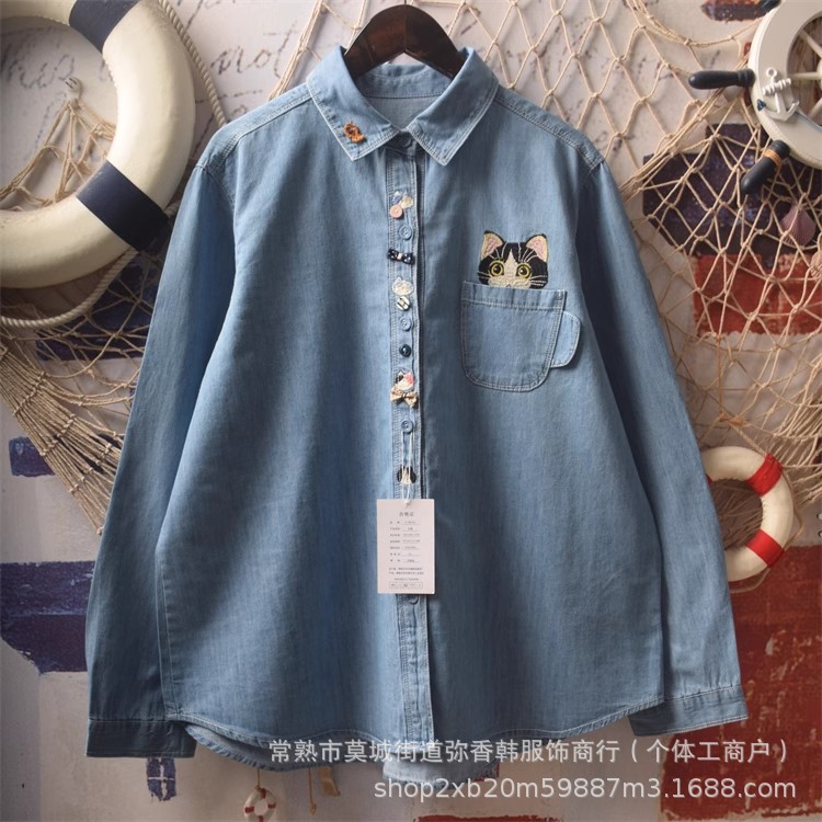 ポケット猫の襟刺繍デニム長袖シャツ女性2025春新作日系学院風ゆるい上着