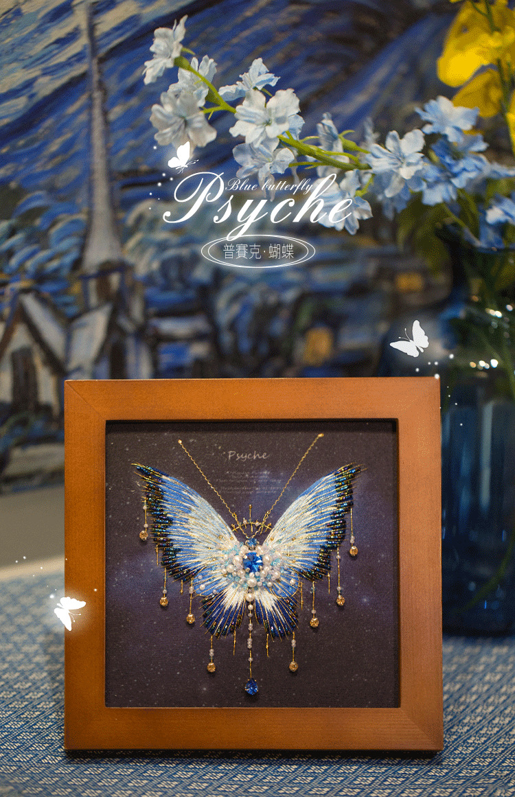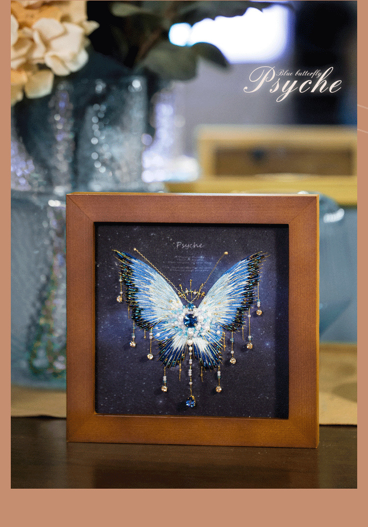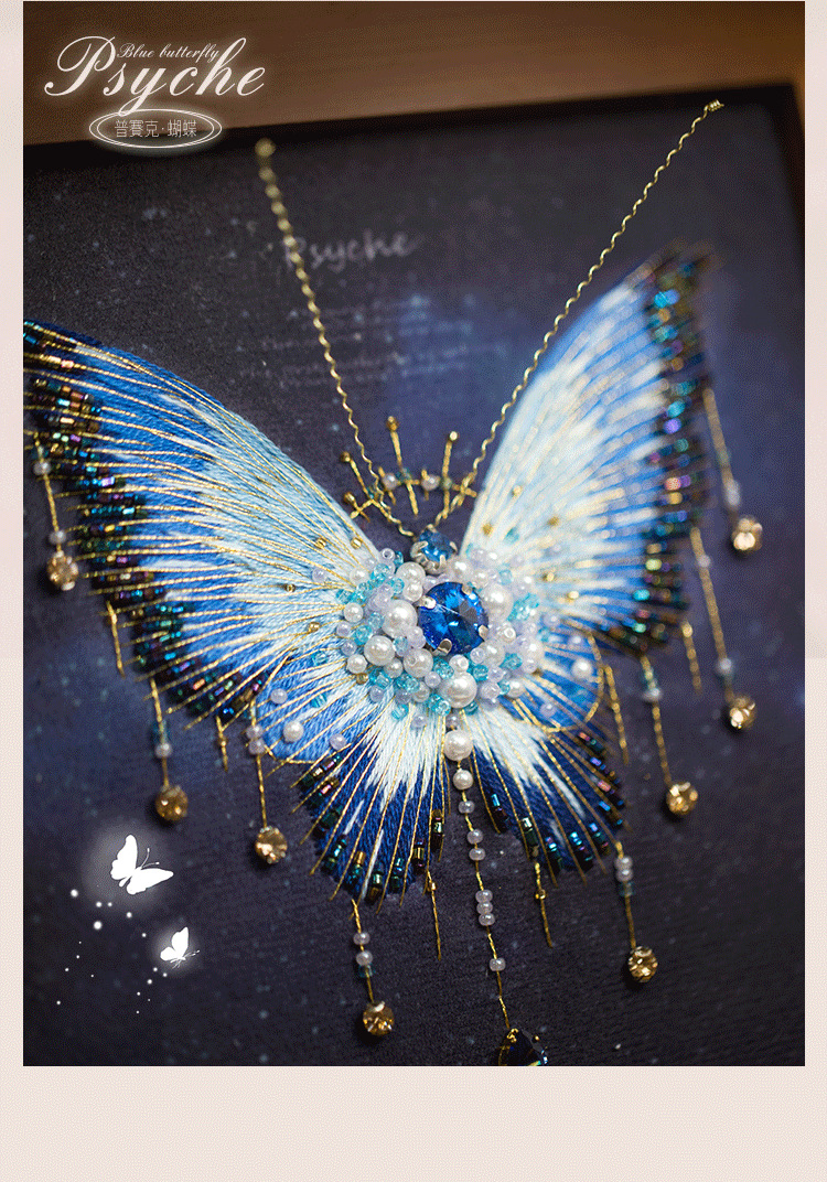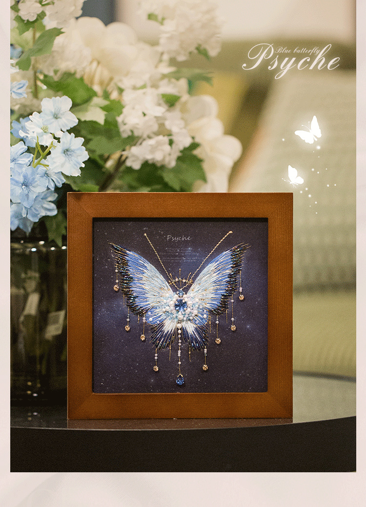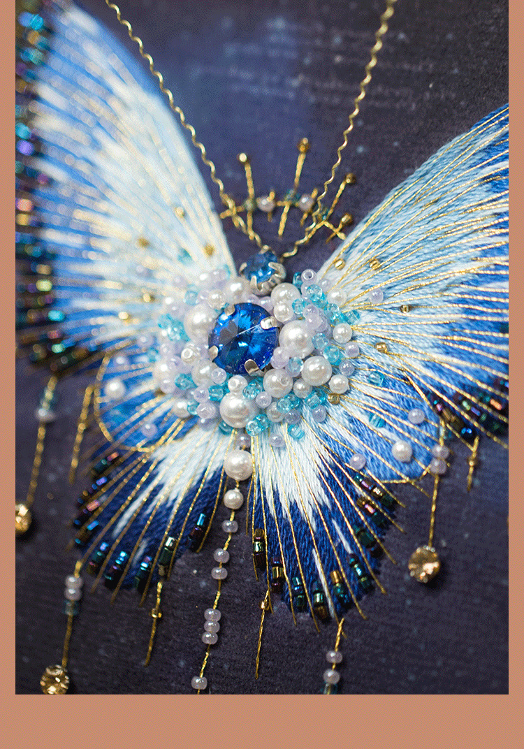 您现在观赏的是蓝蝴蝶,看起来非常华丽,您可能担心他比较复杂,其实制作起来是很快的,先做刺绣的部分,然后再穿珠子,而且蝴蝶的形状、轮廓已经印在面料上了,就像填色游戏一样好玩,珠绣蝴蝶画,实在是居家软装的一个全新体验。