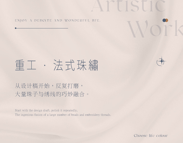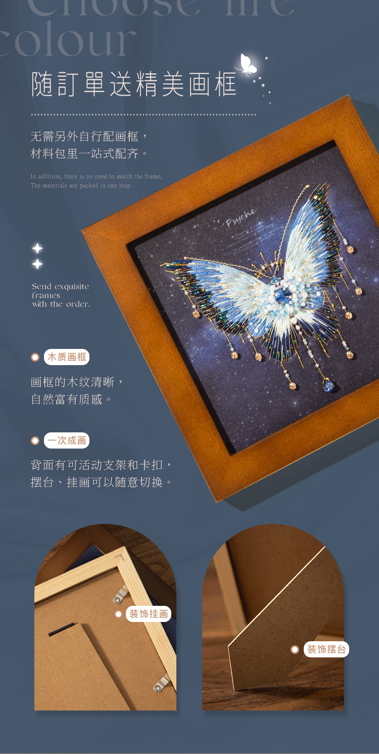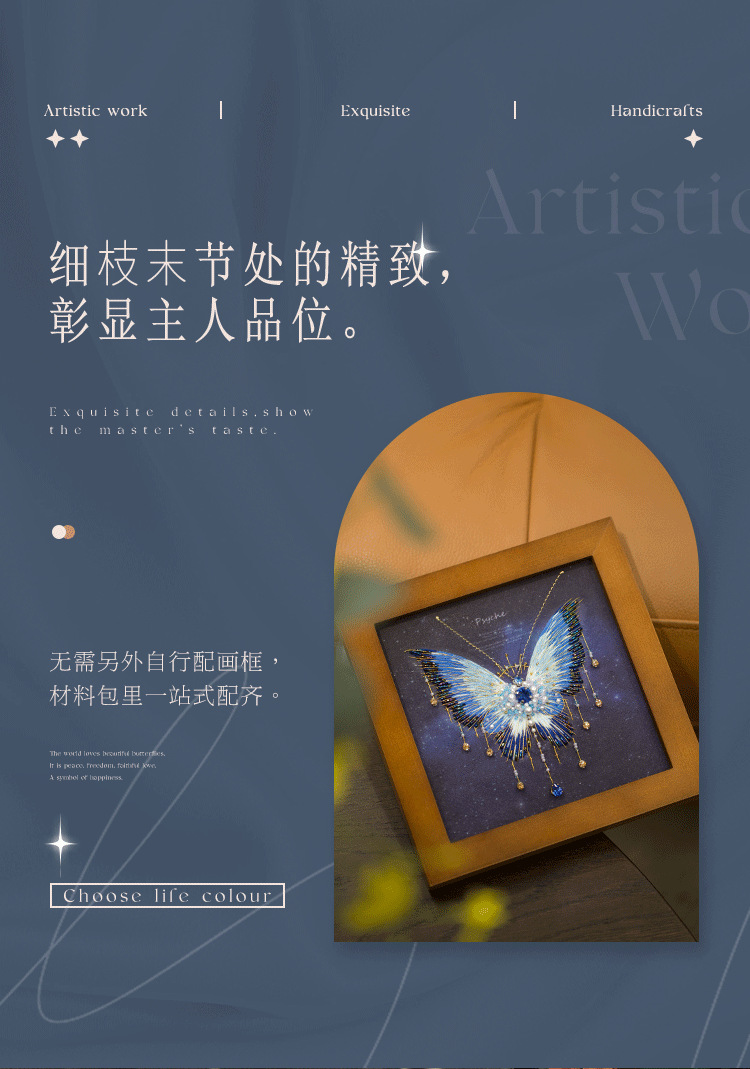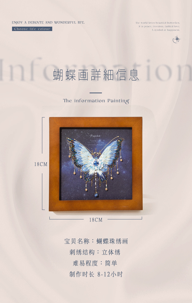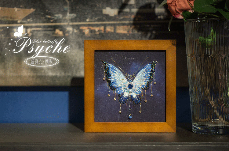 您现在观赏的是蓝蝴蝶,看起来非常华丽,您可能担心他比较复杂,其实制作起来是很快的,先做刺绣的部分,然后再穿珠子,而且蝴蝶的形状、轮廓已经印在面料上了,就像填色游戏一样好玩,珠绣蝴蝶画,实在是居家软装的一个全新体验。
