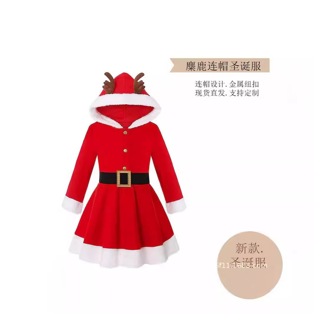 クロスボーダー エルク柄 フード付きクリスマスドレス クリスマスツリー柄スカート 子供用クリスマスドレス フェスティバルドレス カラーブロックデザイン