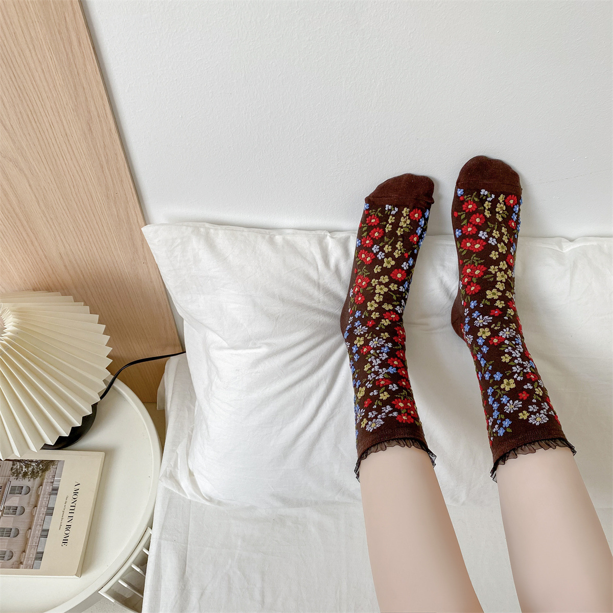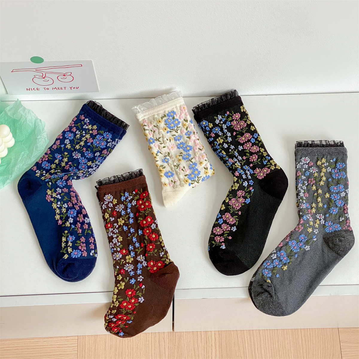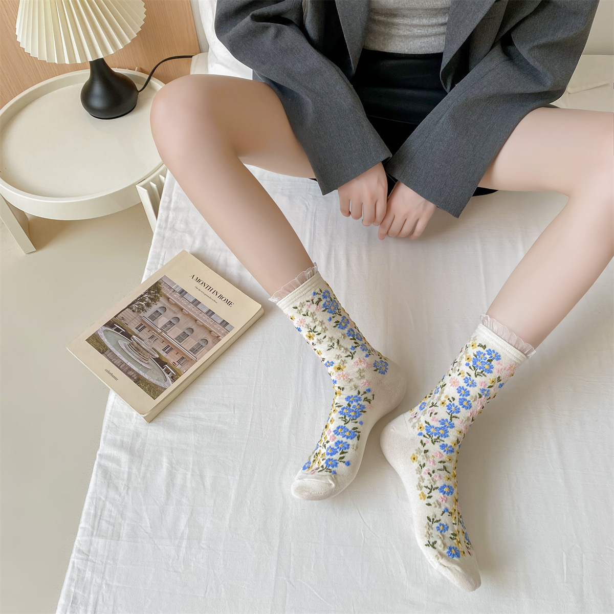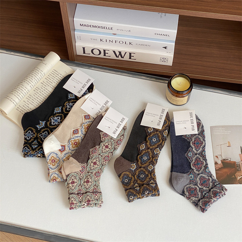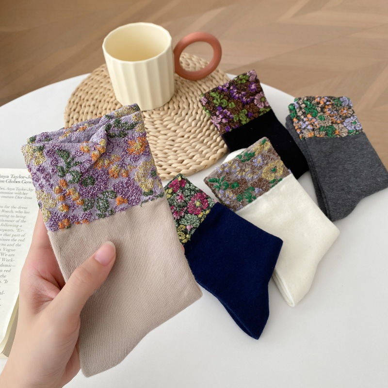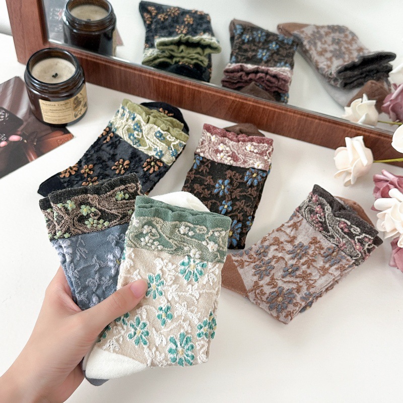 春秋の新作フレンチソックス、宮廷ロリータ風レトロ花柄ミドル丈レディースソックス、和風ルーズフィット綿ソックス