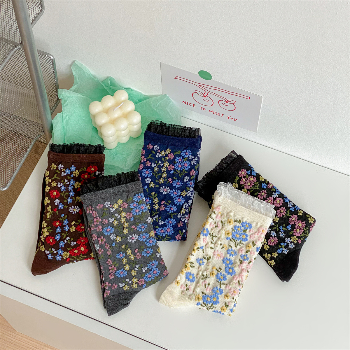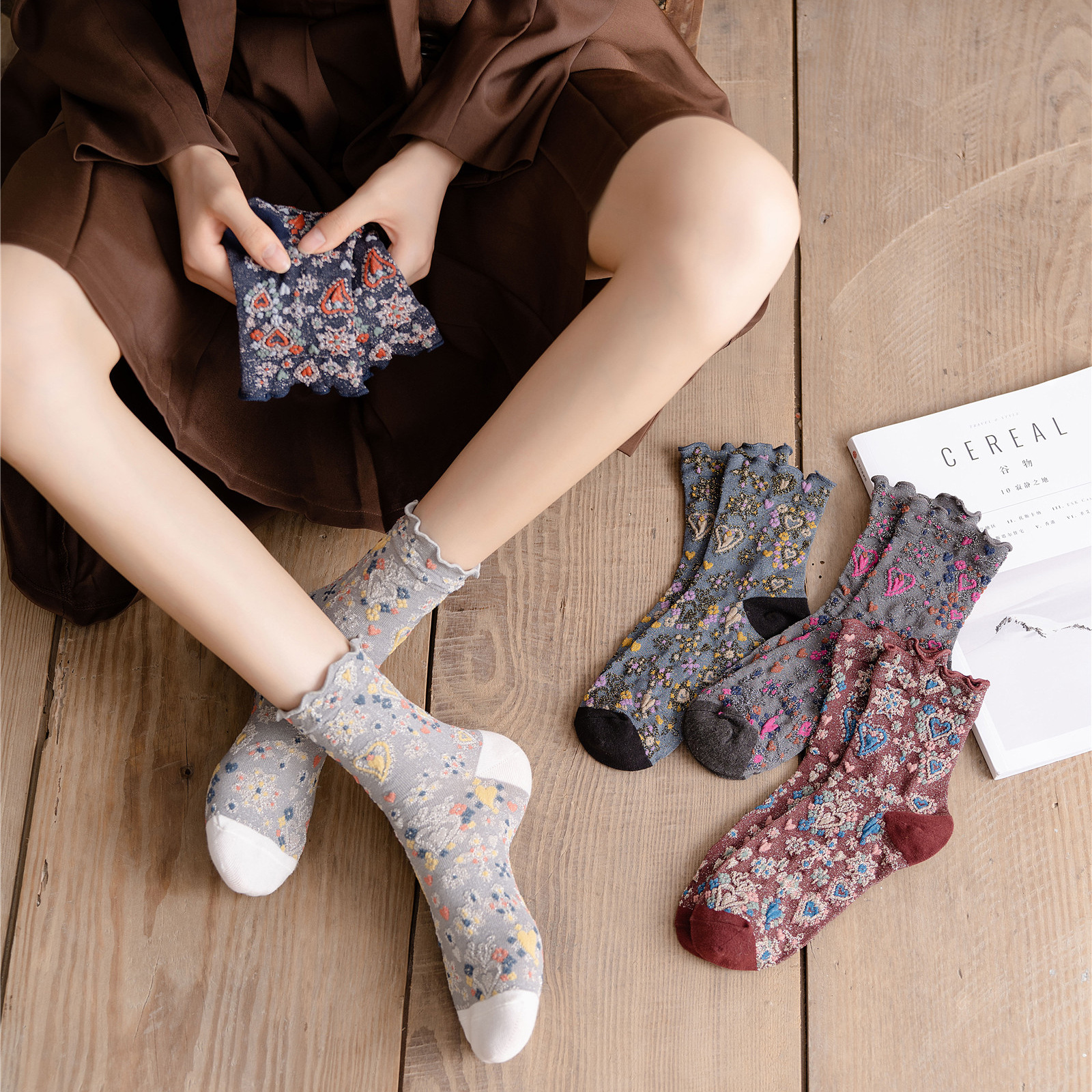 秋冬新品日系复古彩色银丝花朵中筒女袜拼色棉袜ins时尚堆堆潮袜