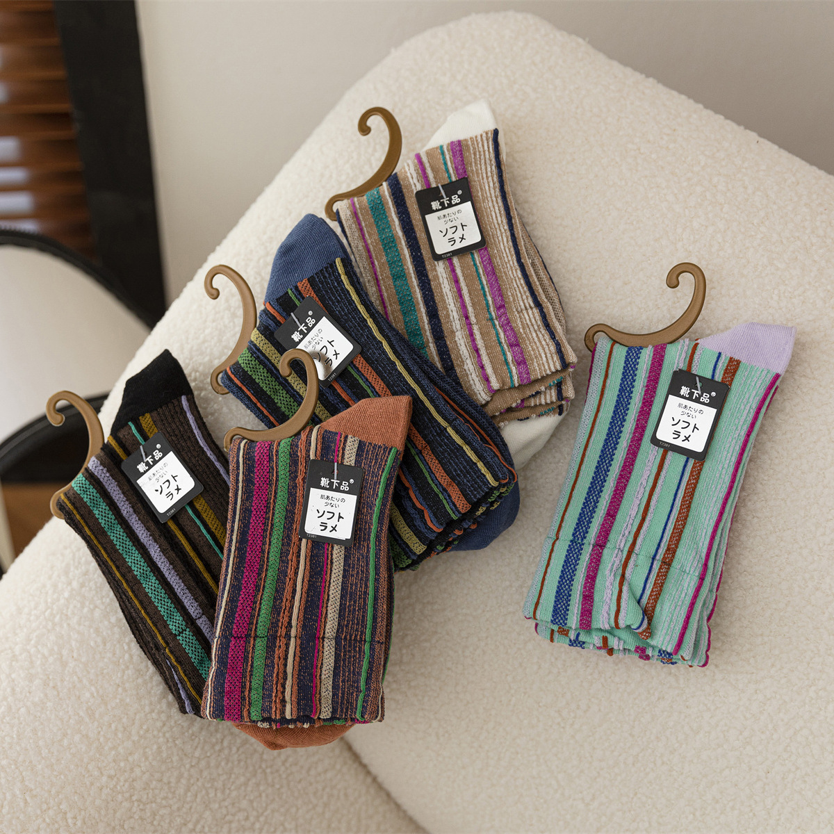 春秋新作リバース織りカラフル縦縞和風ミドル丈レディースソックス レトロ韓国風ルーズフィット綿ソックス
