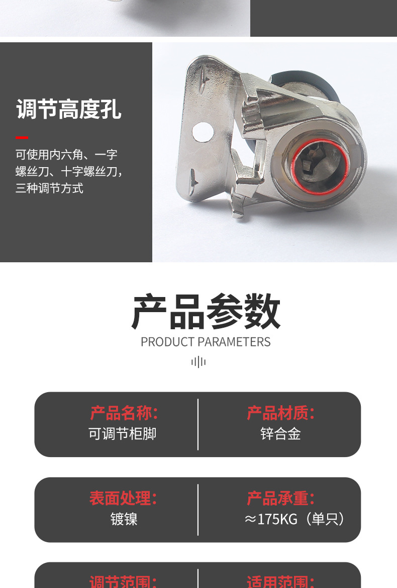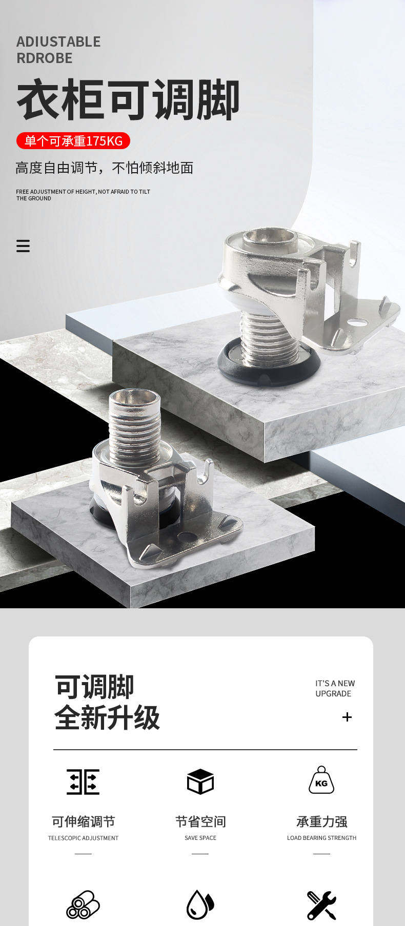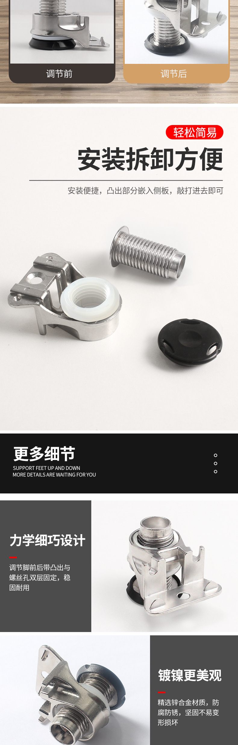 锌合金可调脚防滑橱柜调整脚家具五金可调万向高低脚衣柜调节脚