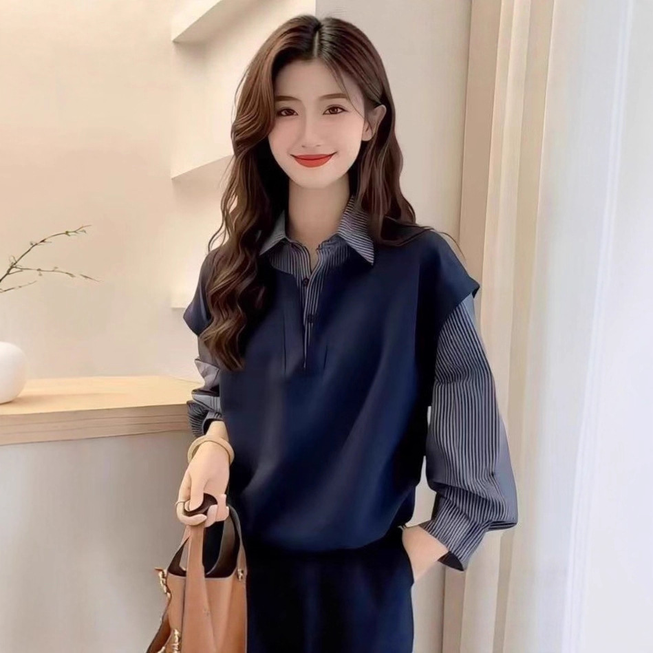 2025秋冬款时尚假两件衬衫翻领拼接条纹外穿卫衣多巴胺女士上衣