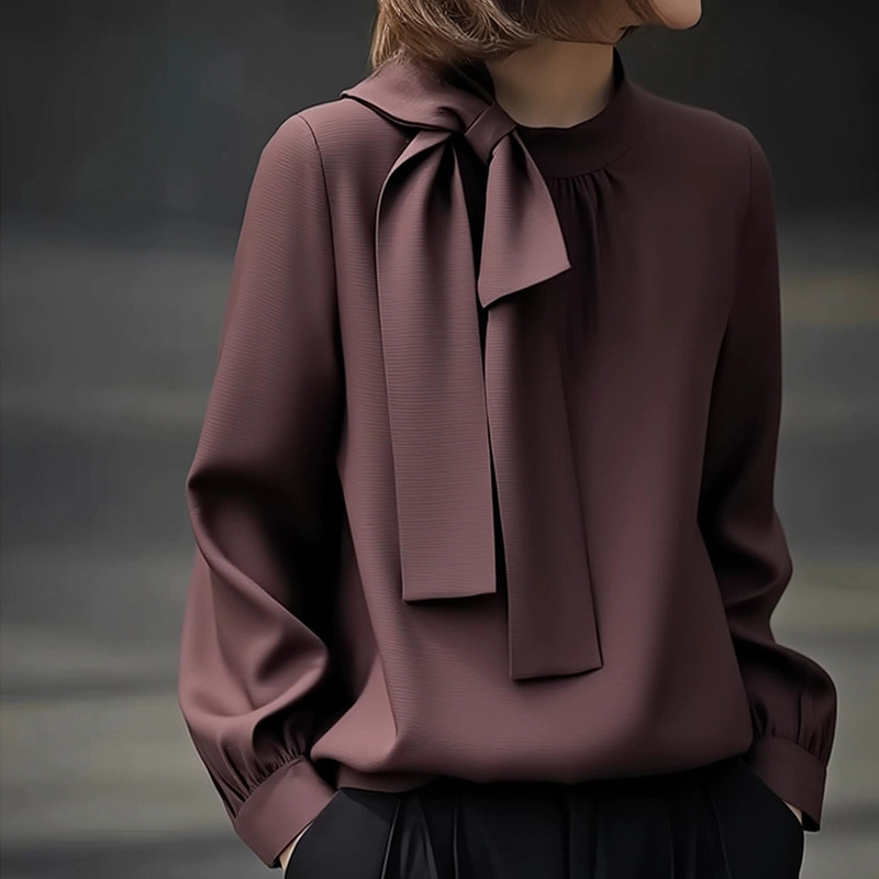 蝶結びの帯の単列のカーディガンのカジュアルなシャツの女性の春と秋の気質の純色の長袖の洋風の年齢を減らすシャツ