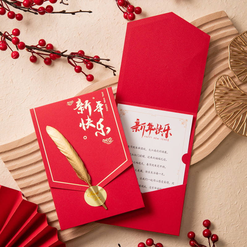 新年の箔押しグリーティングカードの高級感のあるアイデアの羽は、お客様に元日のカードを印刷して感謝の赤いカードを印刷します