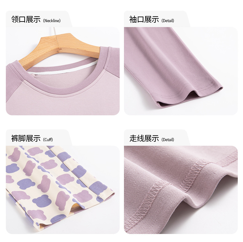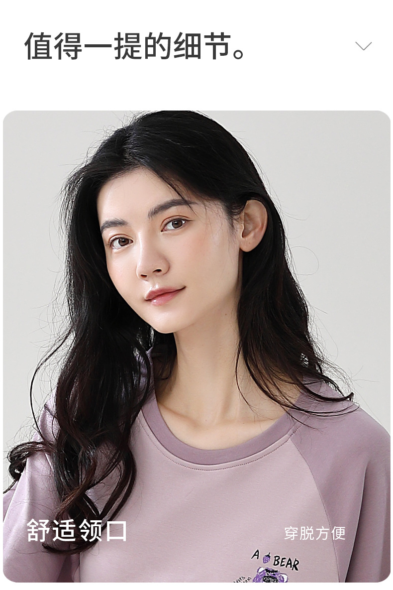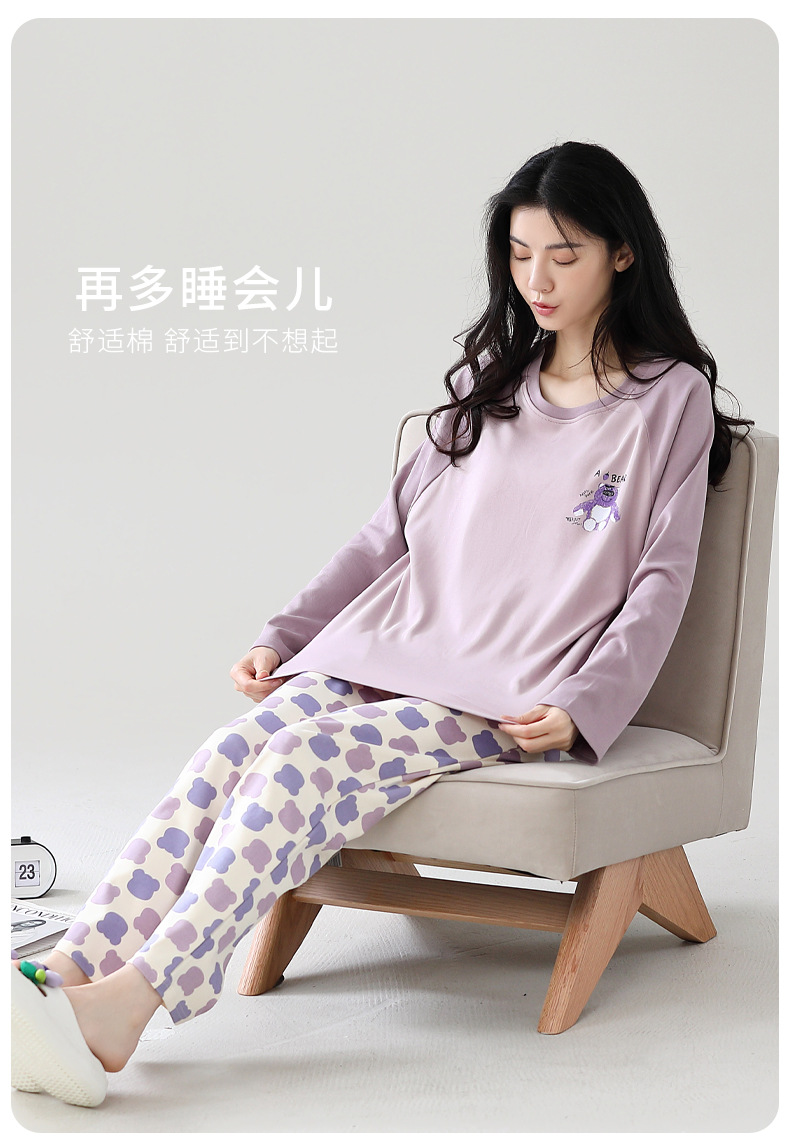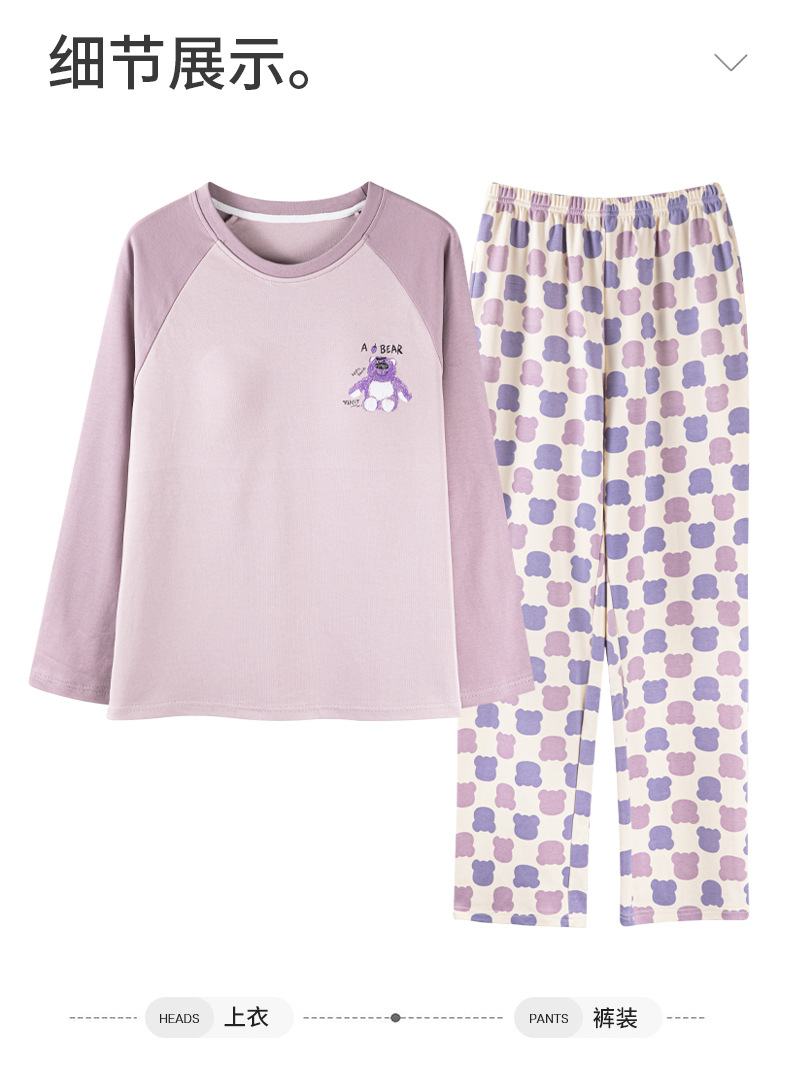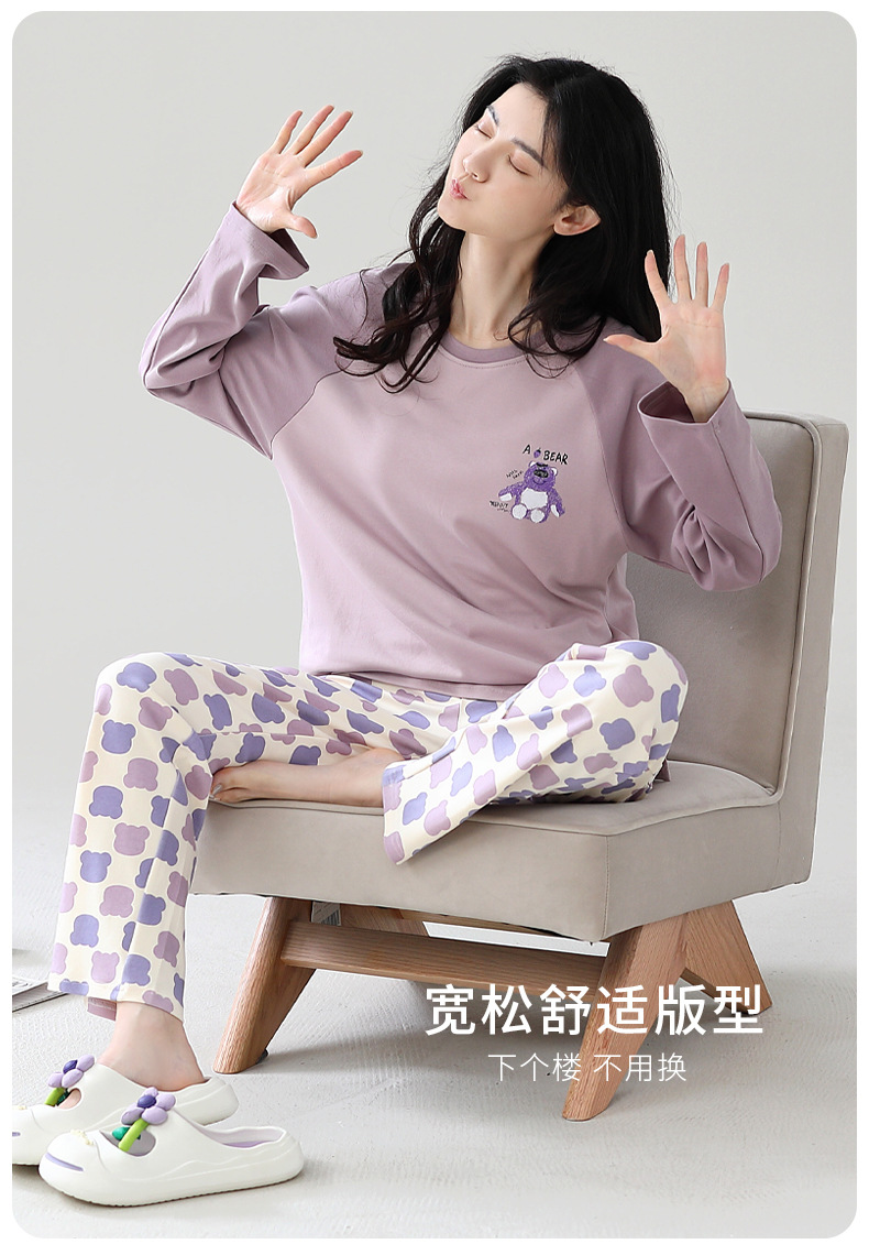100%纯棉睡衣女长袖长裤圆领全棉春秋季休闲舒适可外穿家居服套装