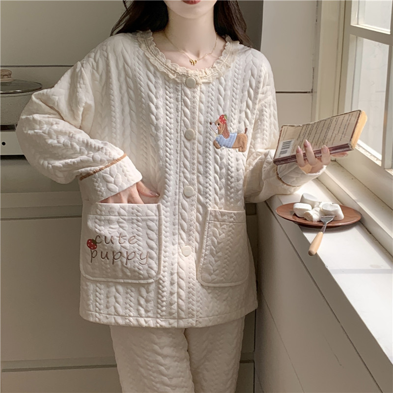 秋冬季空气棉睡衣女两件套加厚提花开衫夹层可爱卡通家居服可外穿