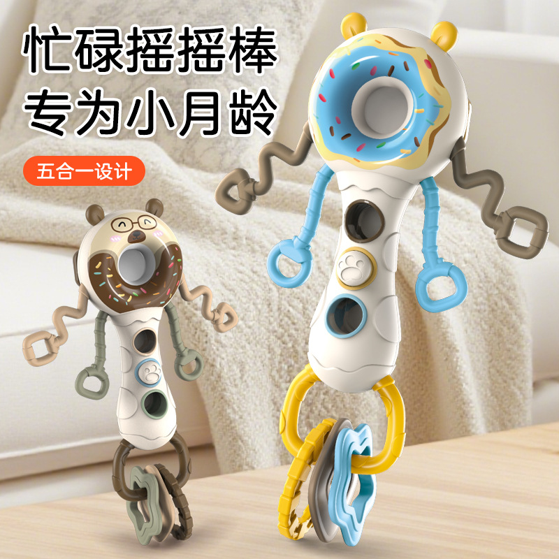 跨境婴儿益智摇摇棒5合1可按压可啃咬牙胶启蒙早教抓握拉拉乐玩具