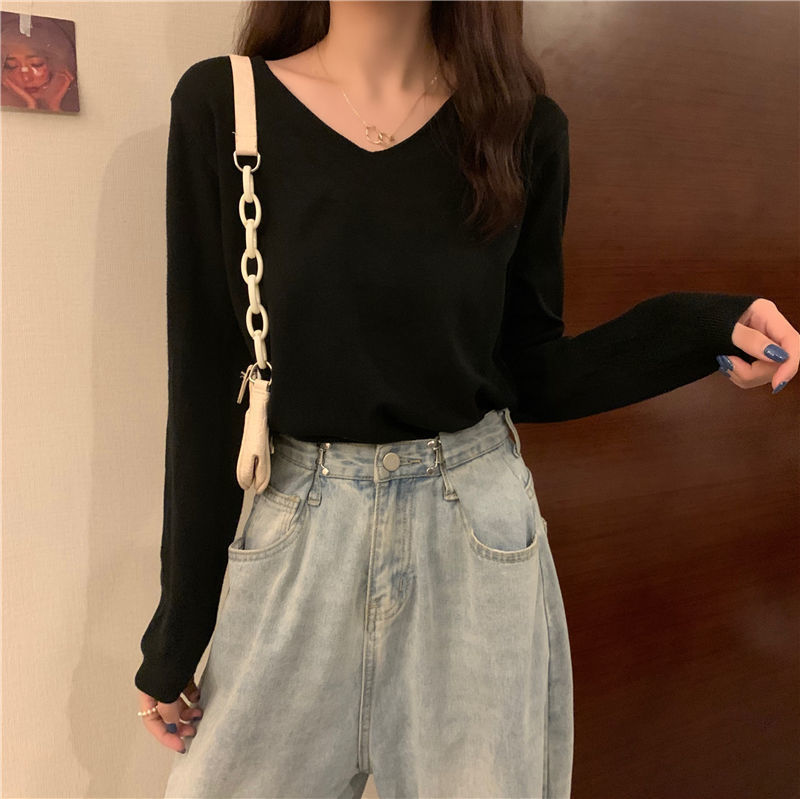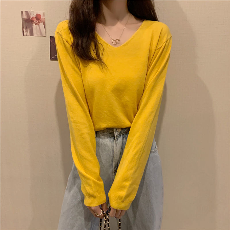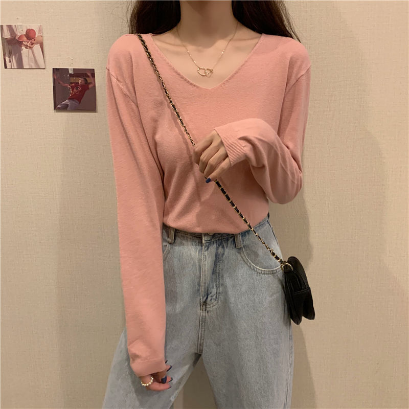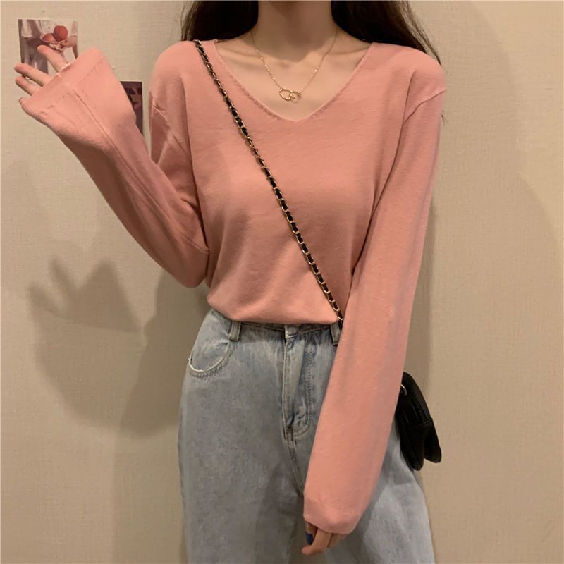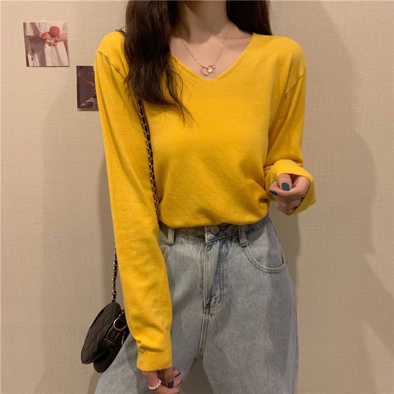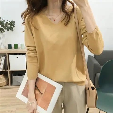 秋冬韓国版2023新型スリムvネックの基礎モデルの純色の中に長袖のニットの上着の婦人服を掛けます。