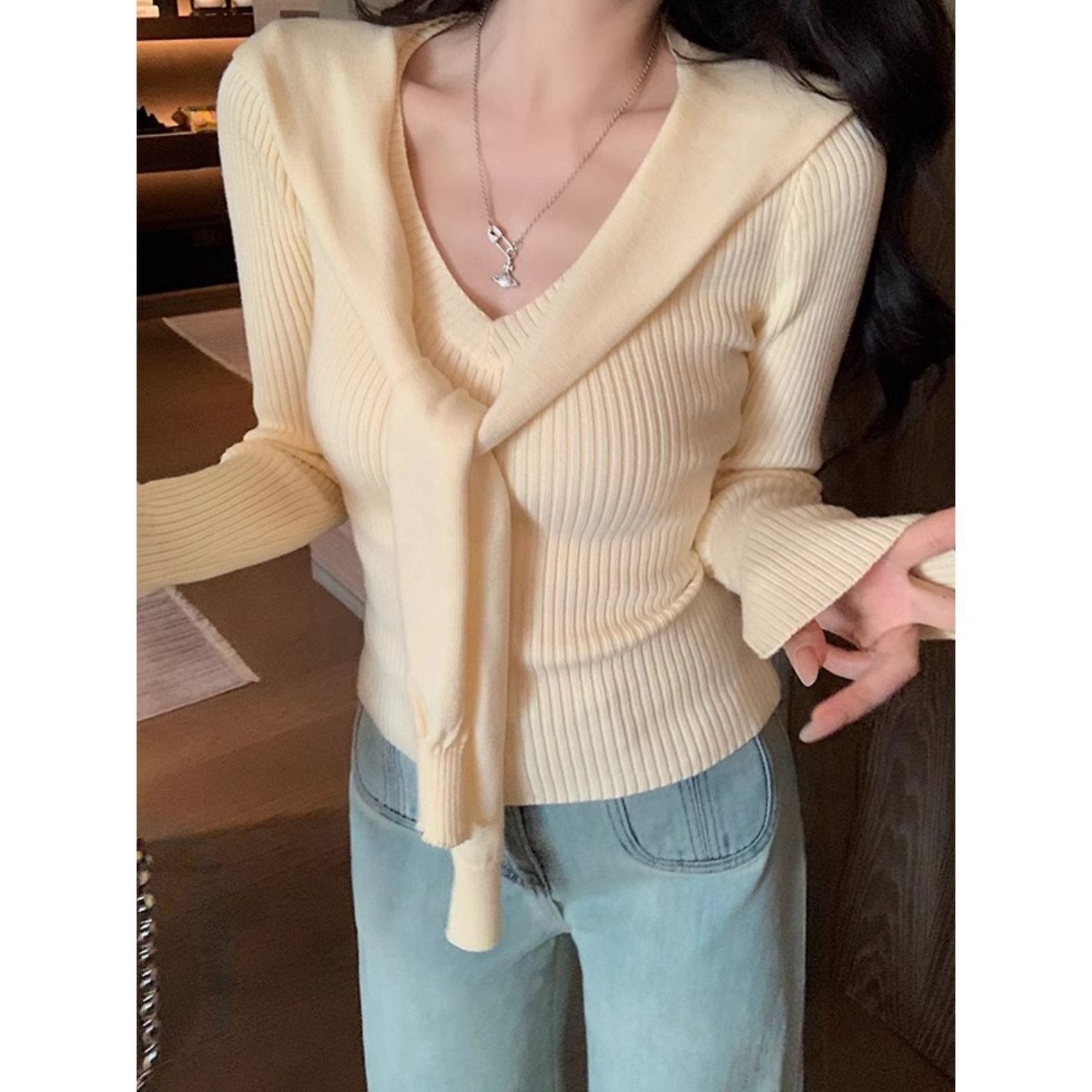 デザイン感クロスvネックニットの底のシャツの女性2023春と秋のファッションの洋風の修身はやせています。