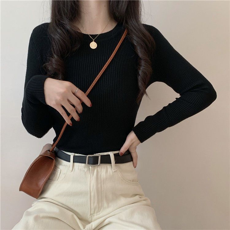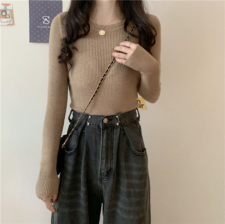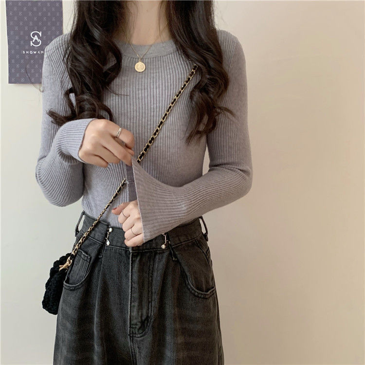 2023春秋の新型の純色の修身はやせている長袖の丸首を見せます。