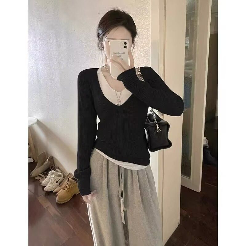 秋冬の偽の2枚のニットの薄いタイプの新型のセーターの底のシャツの外はファッションの気質が見えてやせている上着の女性を現します。