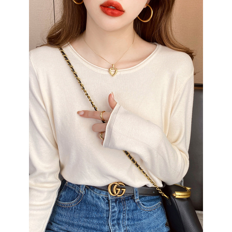 圆领打底衫女白色宽松上衣2025新款内搭春秋装长袖针织毛衣可外穿