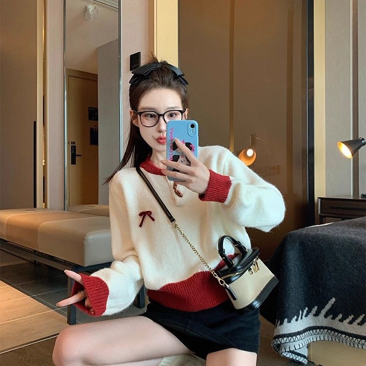 撞色牛角扣套头毛衣女ins新款秋冬外穿奶fufu慵懒短款内搭针织衫