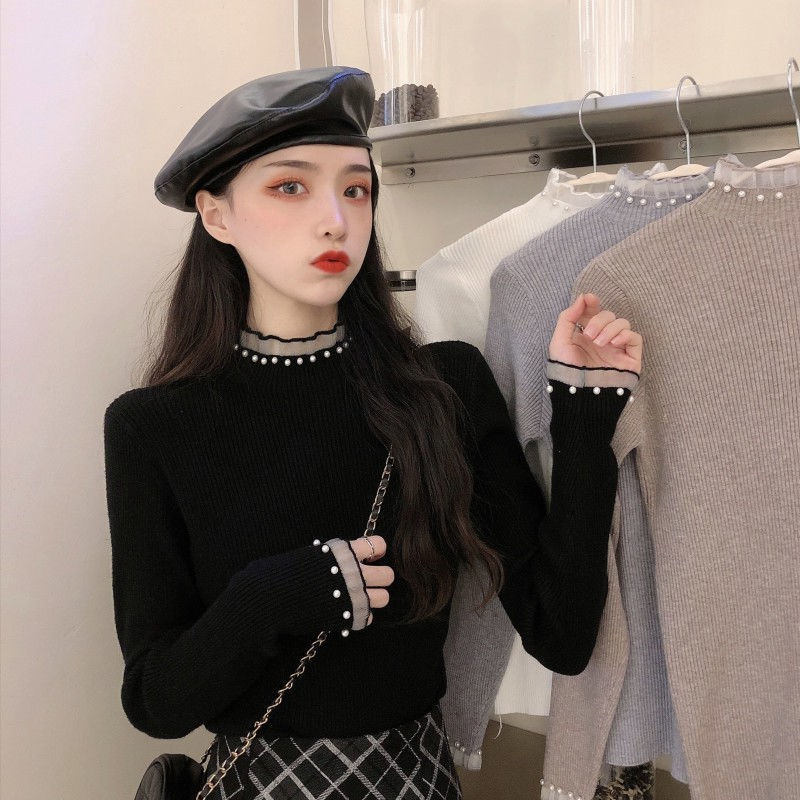 デザイン感のあるレースは真珠の半高襟の長袖のセーターの女性の黒色の頭の高級なレースのニットの底のシャツをつなぎ合わせます。