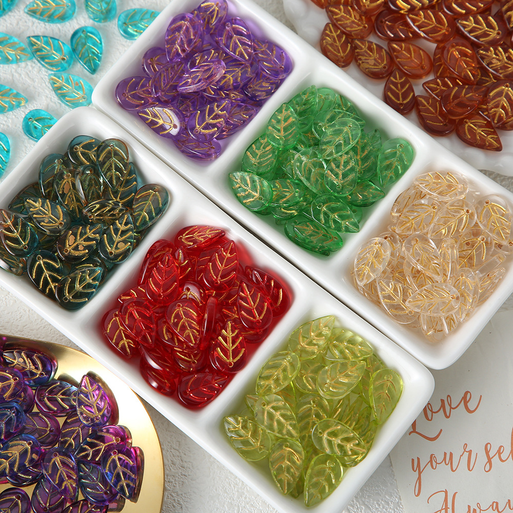 描金树叶11x17捷克琉璃珠 DIY手工制作材料古风汉服水晶散珠配件