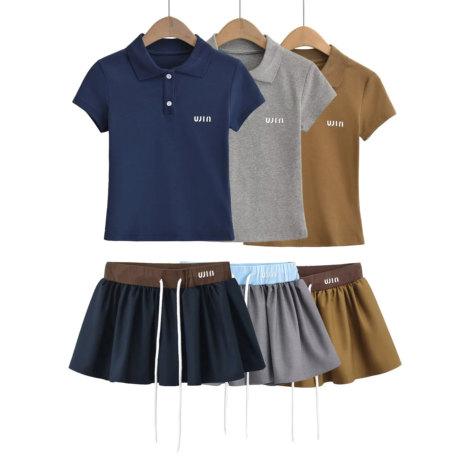 POLOの襟は色のアルファベットのプリントの半袖のtシャツにぶつかります。