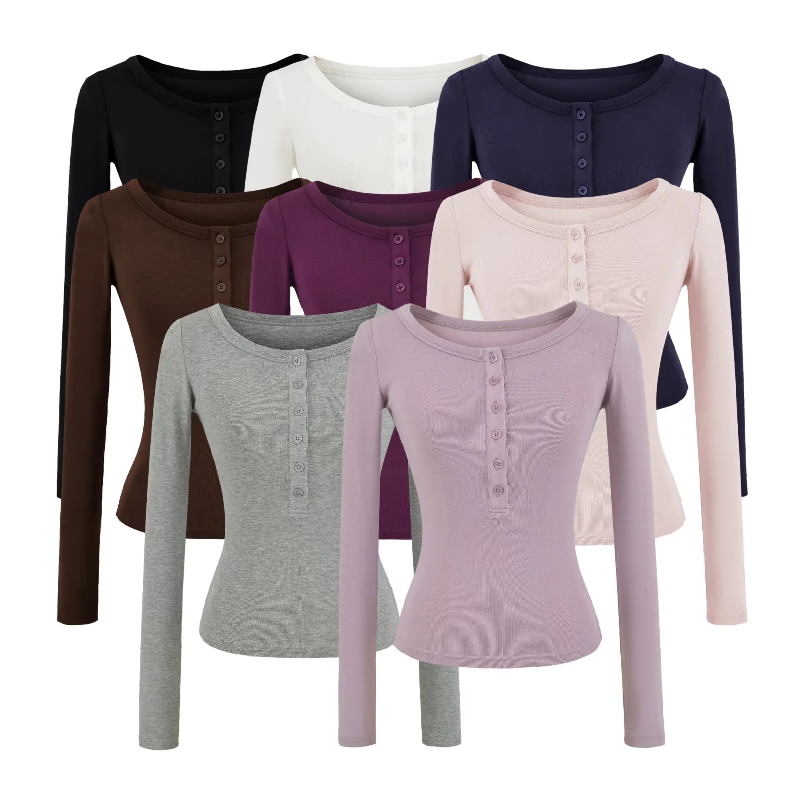 Luluは同じタイプのヘンリー襟のアーチ型の裾の長袖の底のシャツの女性の修身が見えて痩せています。