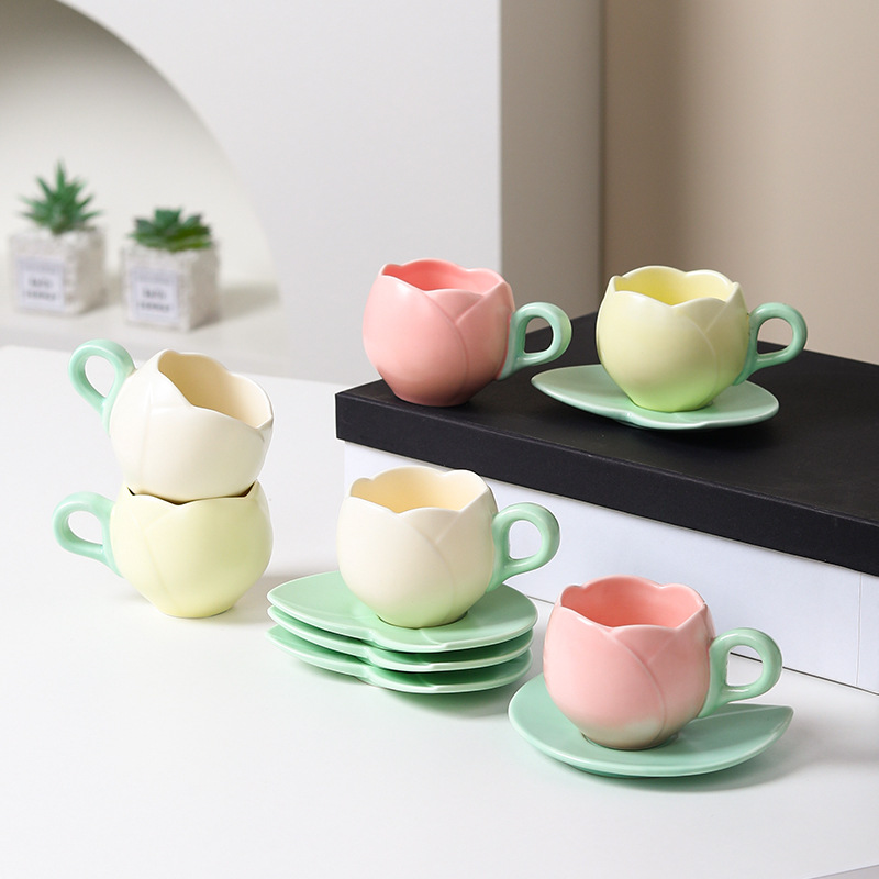 チューリップコーヒーカップセット家庭用セラミックカプチーノカップ朝食カップとソーサーエスプレッソセラミックコーヒーカップとソーサー