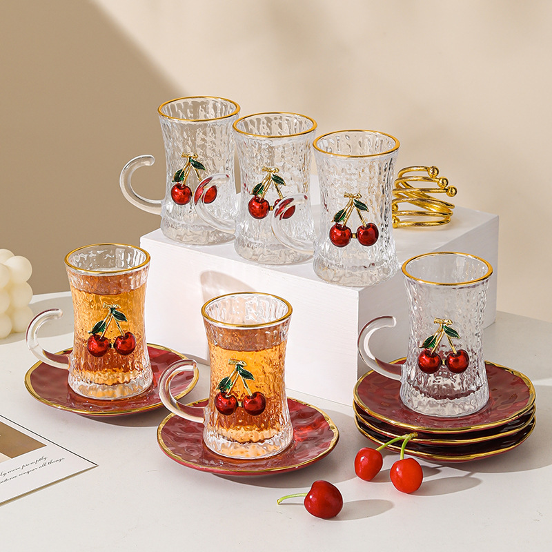 クリエイティブガラスコーヒーカップとソーサーチェリーセラミックコーヒーカップとソーサーアフタヌーンティー紅茶カップとソーサーホームコーヒーカップとソーサー