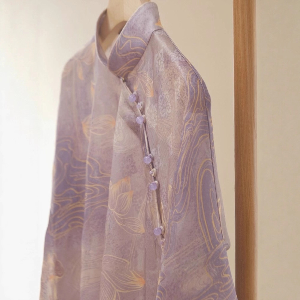 女性用ライトパープルメッシュボタン付きシャツトップ、ユニークなデザイン、ショートフロントとロングバック、レトロでエレガントな気質、新しい国民スタイル